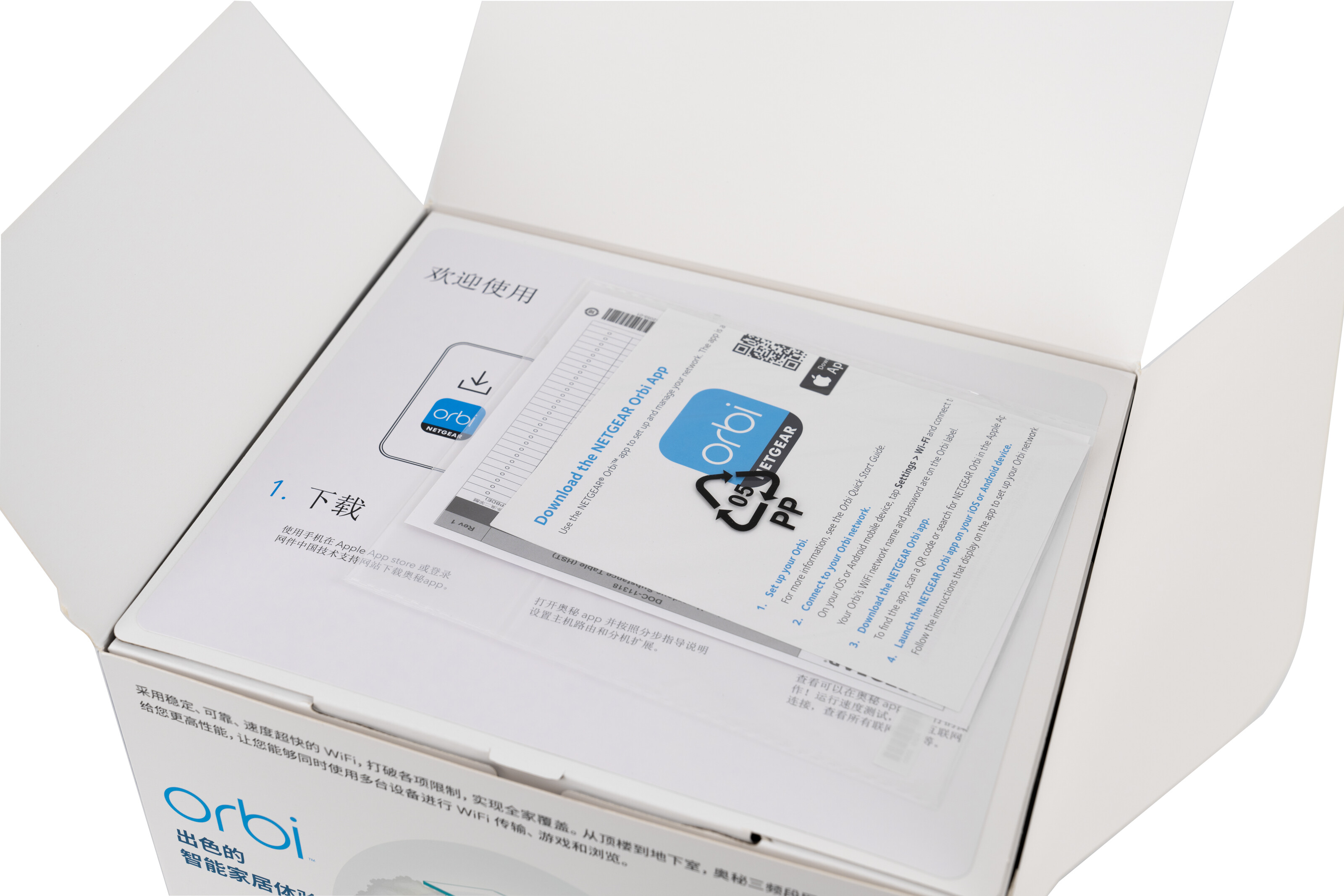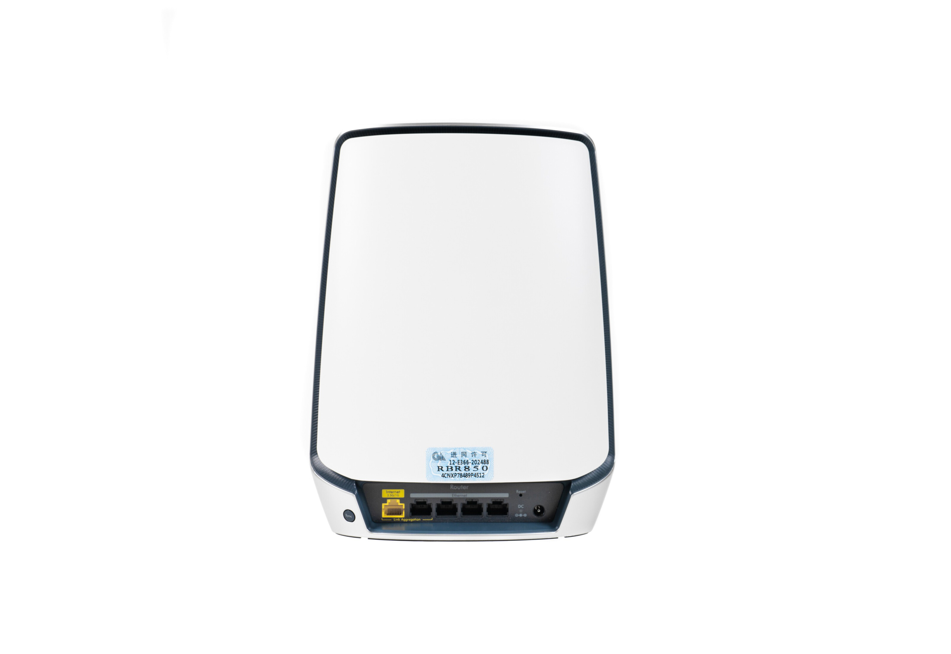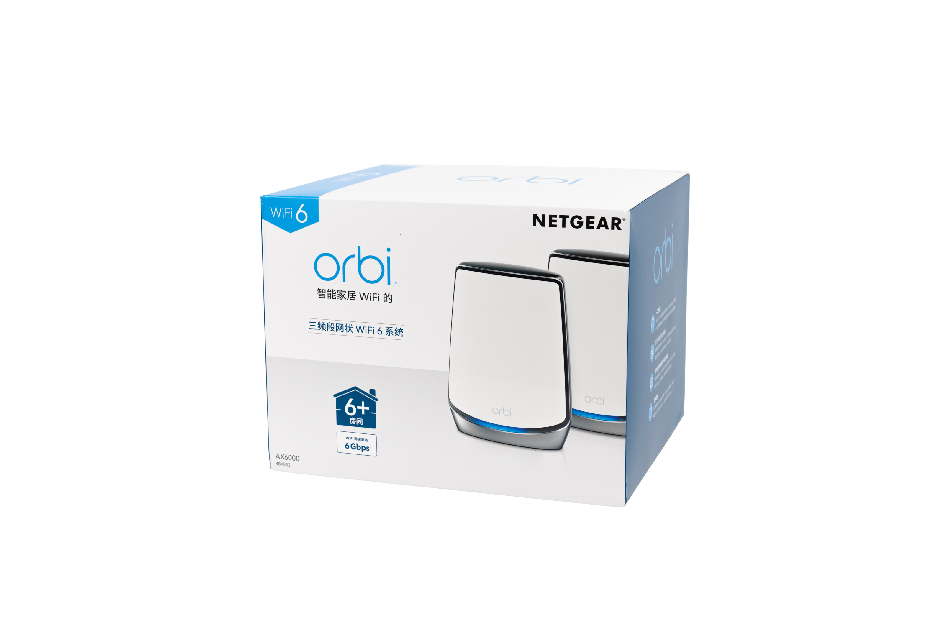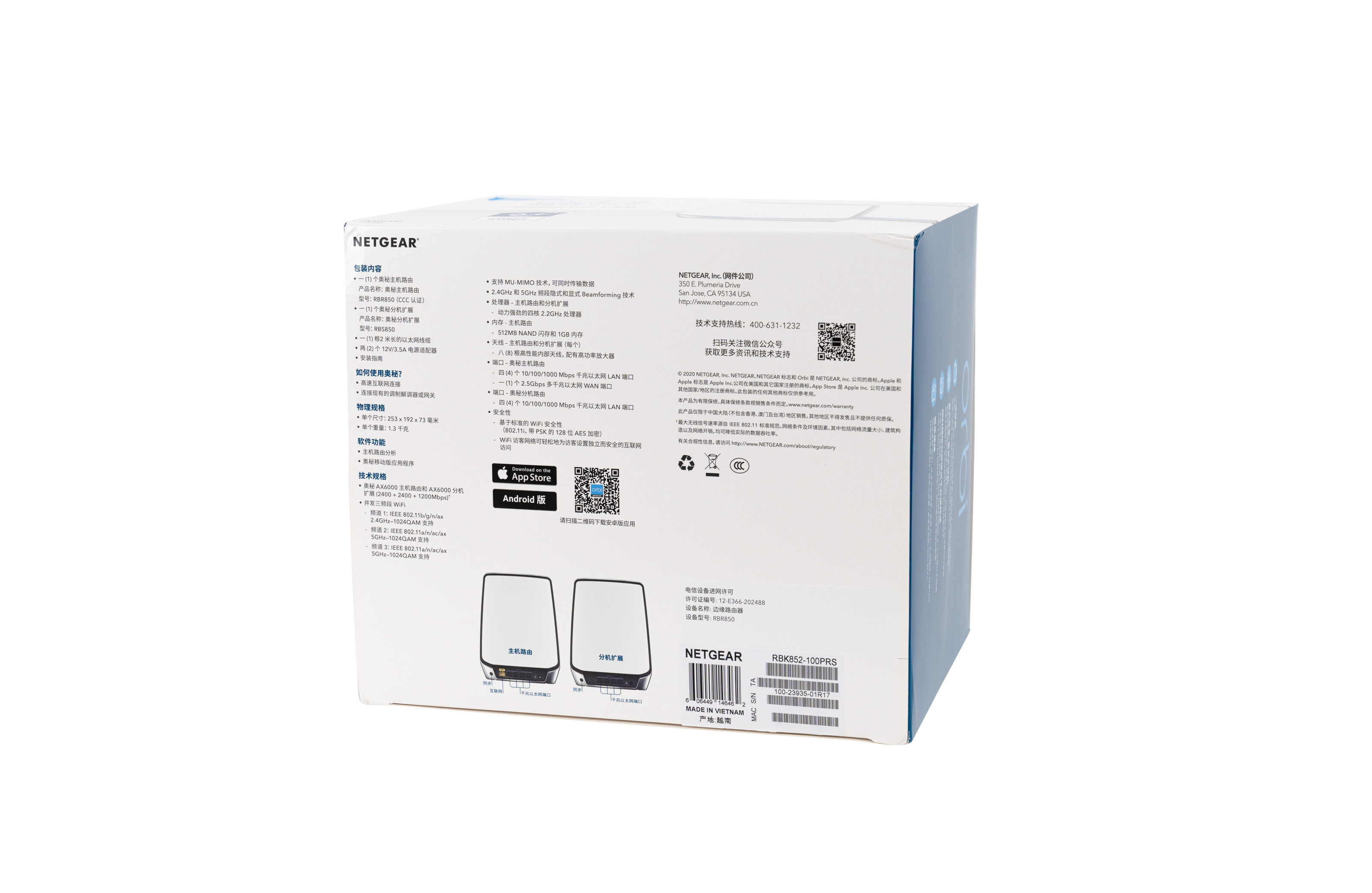 •RBK852中包含了一只RBR850路由和一只RBS850分身,外包装采用蓝白配色,可以看到这是一套三频段网状WiFi6系统,左下角的AX6000表明了它的无线规格,适用于6个房间以上的房屋 •包装盒底部是RBK852的详细规格,以及主机和分身的IO接口介绍;机器制造产地是越南 •打开包装盒的顶盖是一张快速安装指导手册和一张APP二维码下载说明;可以使用手机扫描二维码下载APP来配置RBK852,简单高效 •继续打开内包装就可以看到RBR850主机和RBS850分身以及附件盒 •打开附件,盒中装的是两只双孔电源适配器和一根超五类扁平网线 •RBR850主机正面一览。机身上套有透明的塑料环,印有QR配对码。使用ORBI APP扫描机身上的QR码可以迅速将RBR850主机添加进网络 •RBR850主机背面,国行版的机器后盖上贴有进网许可。底部IO接口从左往右分别是SYNC同步按钮,2.5G RJ45 WAN口,四个千兆RJ45 LAN口,Reset按钮,DC电源插孔。其中WAN口和LAN1口支持端口聚合 •单从正面来看,RBS850分身和RBR850主机没有任何区别 •不同之处位于背面,RBS850分身比RBR850主机少了一个黄色的2.5G WAN口;具体IO接口从左往右分别是SYNC同步按钮,四个千兆RJ45 LAN口,Reset按钮,DC电源插孔 •RBR850主机和RBS850分身合影RBK852开箱