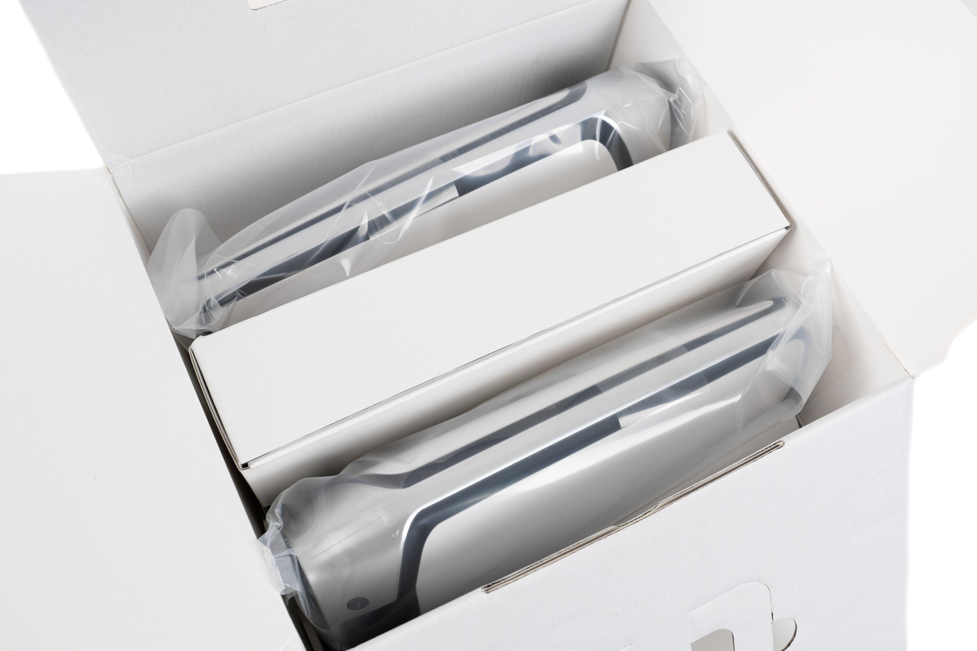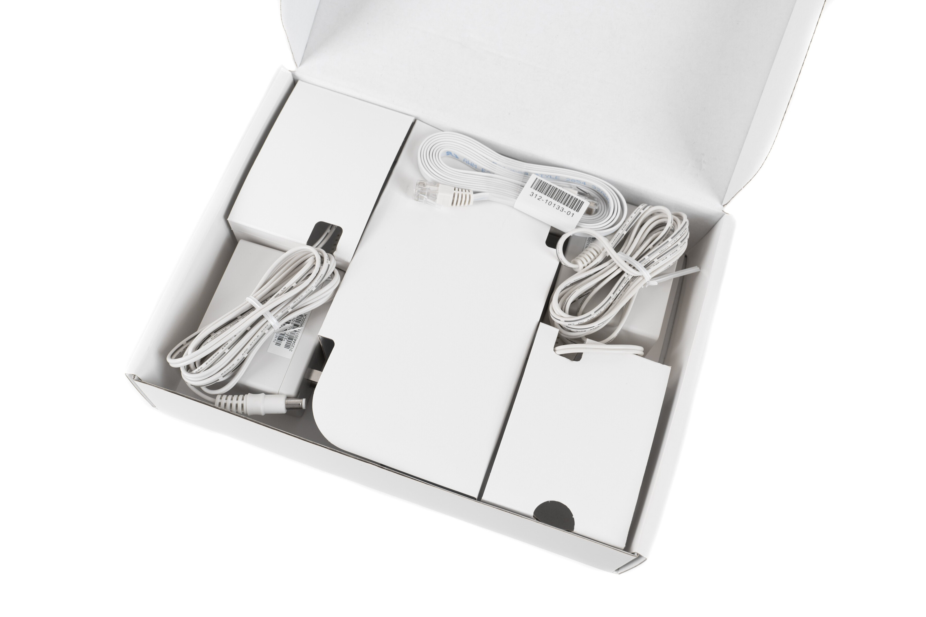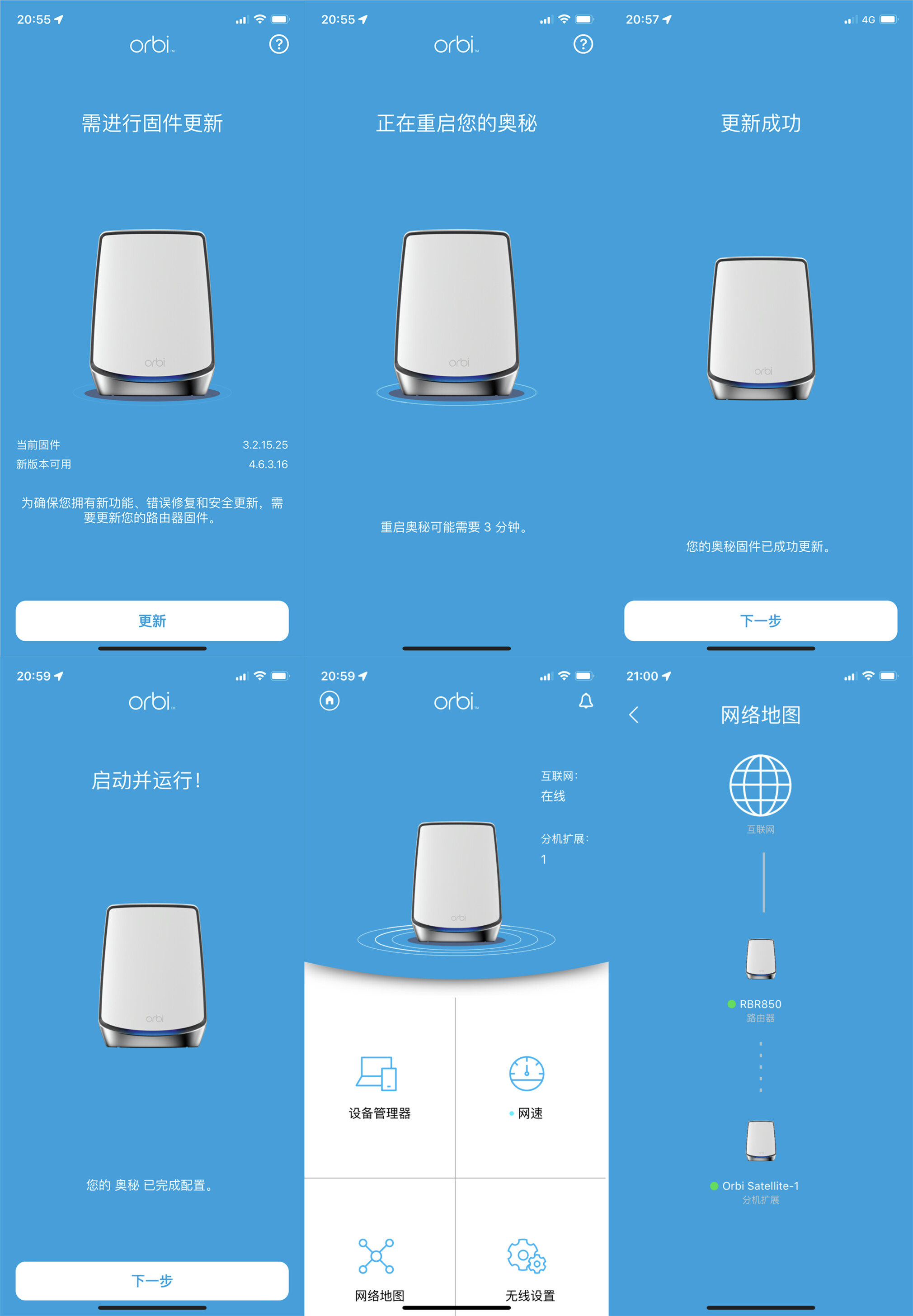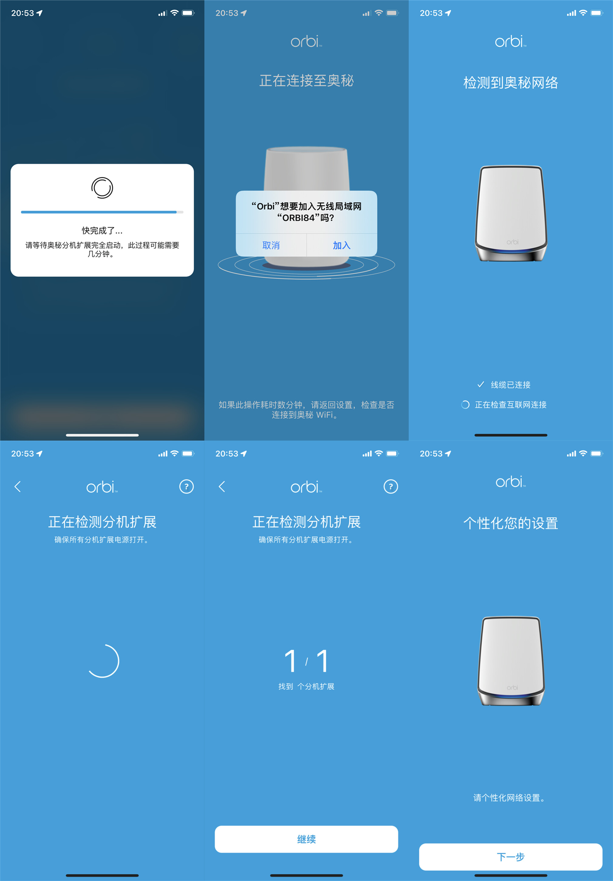 •RBK852中包含了一只RBR850路由和一只RBS850分身,外包装采用蓝白配色,可以看到这是一套三频段网状WiFi6系统,左下角的AX6000表明了它的无线规格,适用于6个房间以上的房屋 •包装盒底部是RBK852的详细规格,以及主机和分身的IO接口介绍;机器制造产地是越南 •打开包装盒的顶盖是一张快速安装指导手册和一张APP二维码下载说明;可以使用手机扫描二维码下载APP来配置RBK852,简单高效 •继续打开内包装就可以看到RBR850主机和RBS850分身以及附件盒 •打开附件,盒中装的是两只双孔电源适配器和一根超五类扁平网线 •RBR850主机正面一览。机身上套有透明的塑料环,印有QR配对码。使用ORBI APP扫描机身上的QR码可以迅速将RBR850主机添加进网络 •RBR850主机背面,国行版的机器后盖上贴有进网许可。底部IO接口从左往右分别是SYNC同步按钮,2.5G RJ45 WAN口,四个千兆RJ45 LAN口,Reset按钮,DC电源插孔。其中WAN口和LAN1口支持端口聚合 •单从正面来看,RBS850分身和RBR850主机没有任何区别 •不同之处位于背面,RBS850分身比RBR850主机少了一个黄色的2.5G WAN口;具体IO接口从左往右分别是SYNC同步按钮,四个千兆RJ45 LAN口,Reset按钮,DC电源插孔 •RBR850主机和RBS850分身合影RBK852开箱