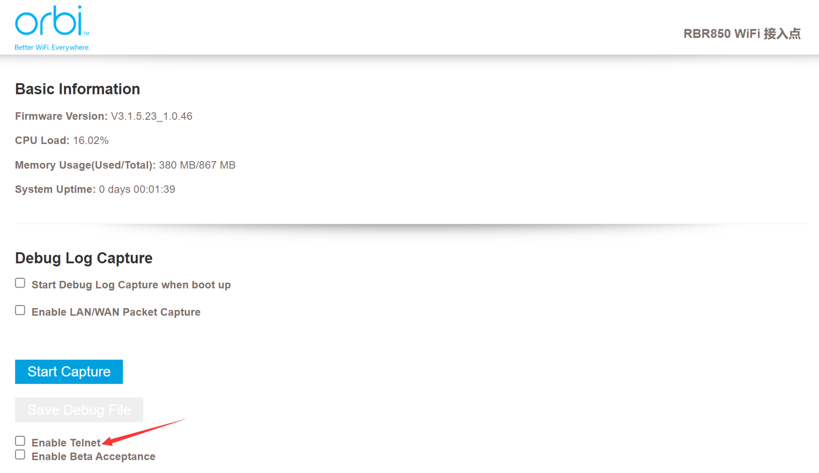 更改无线地区可以达到增强无线发射功率的目的。而RBK852最新固件的无线地区锁死中国区无法更改,并且Debug页面也没有Telnet选项,所以我们需要先降级固件。需要注意的是V4.0以上的固件无法降级