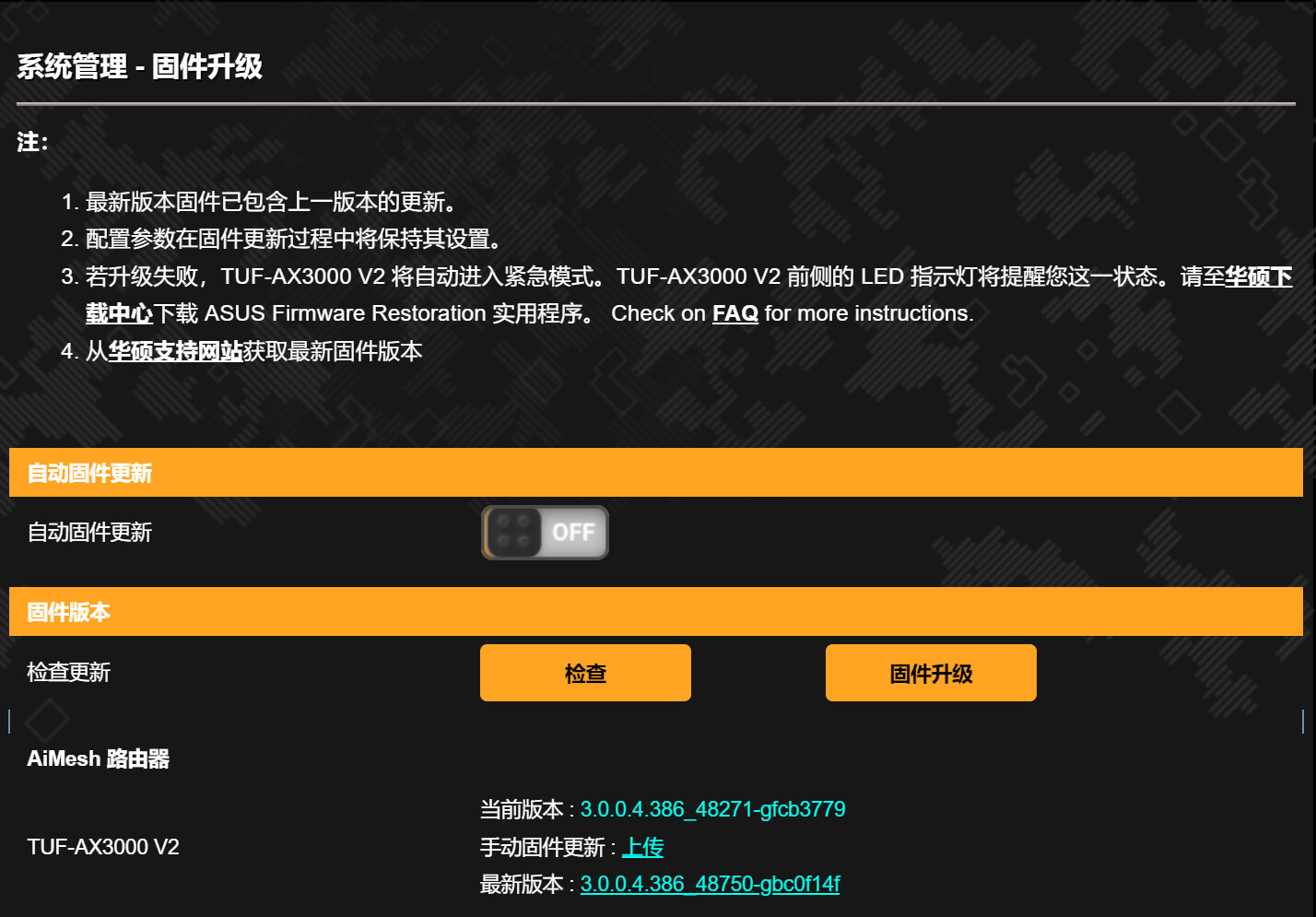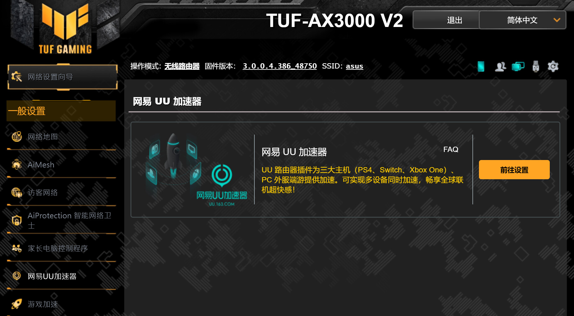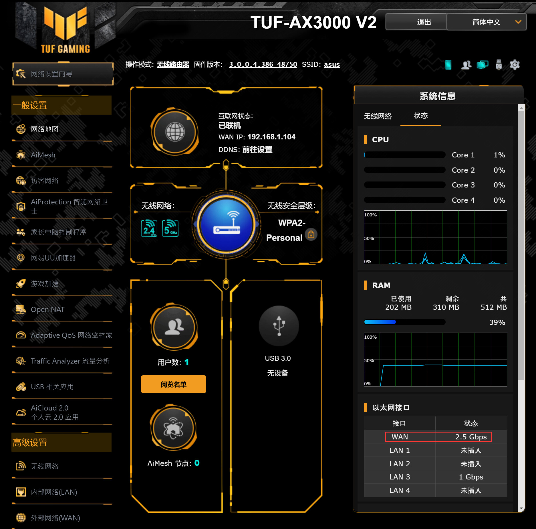 ▲配置主页面可以看到TUF-AX3000 V2采用了四核心的CPU,内存为512MB,WAN口支持2.5Gbps的连接速率 ▲TUF-AX3000 V2自带的网易UU加速器可以实现多设备同时加速 ▲无线网络部分,TUF-AX3000 V2的5G支持160MHz的频宽 ▲无线网络—专业设置里可以切换无线地区来达到增强WiFi的发射功率 ▲从386.41700及以上的固件版本,华硕加入了NAT类型功能支持;某些游戏机的需要采用NAT类型来作IP辨识,此时将NAT类线改为全锥形即可 ▲双线路可以将WAN+任意LAN作为宽带线路接入 ▲LAN1和LAN2支持802.3ad链路聚合 ▲系统管理—固件升级里可以升级至最新固件吞吐量测试