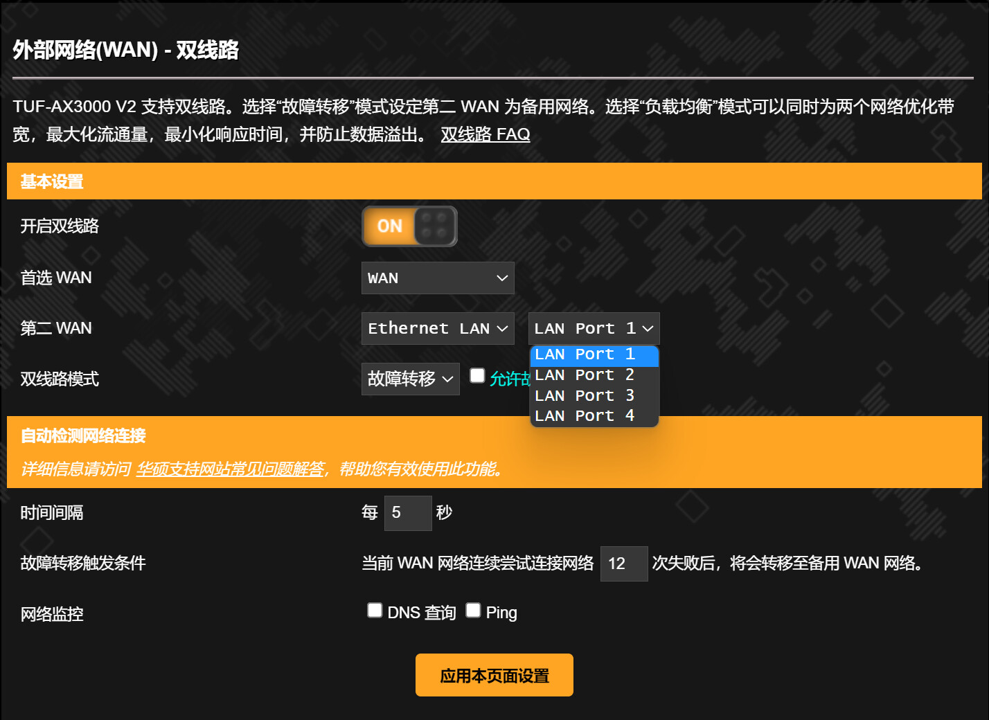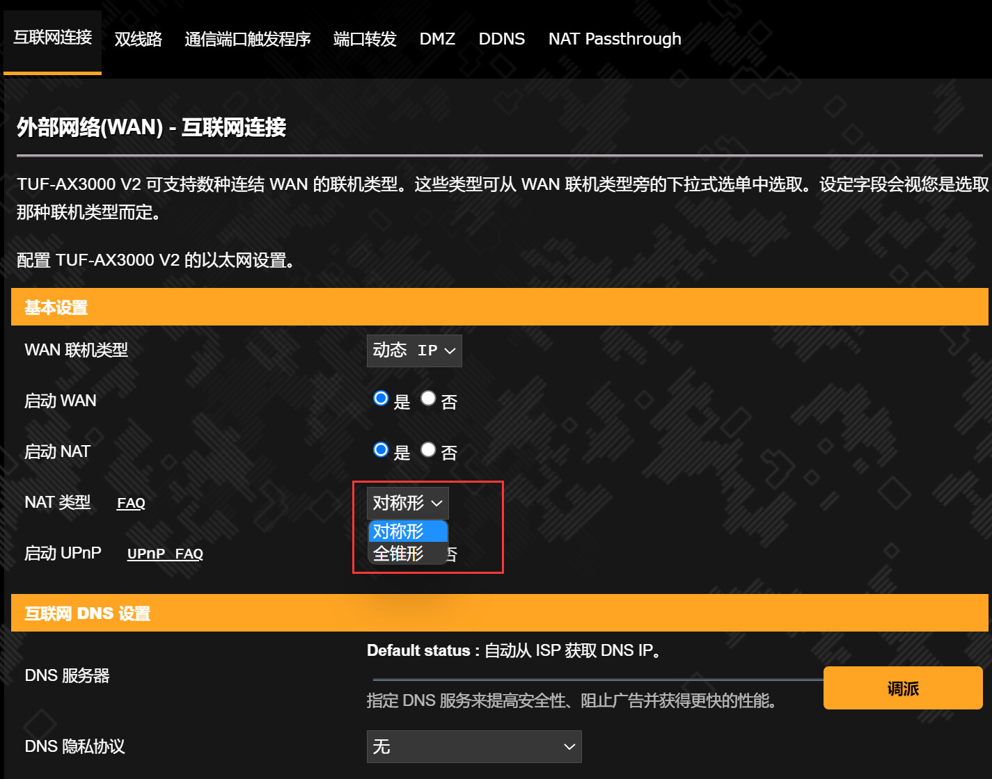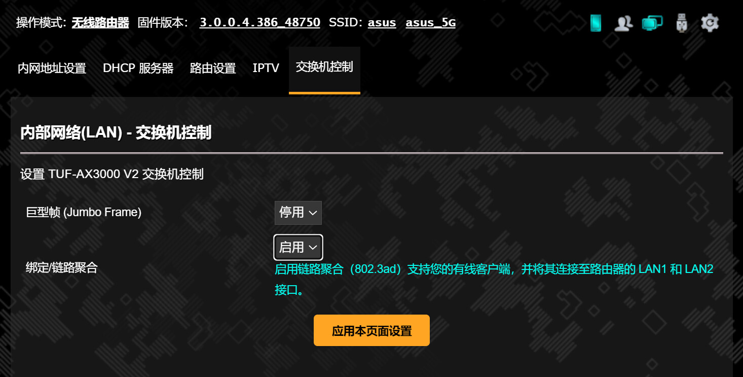 ▲配置主页面可以看到TUF-AX3000 V2采用了四核心的CPU,内存为512MB,WAN口支持2.5Gbps的连接速率 ▲TUF-AX3000 V2自带的网易UU加速器可以实现多设备同时加速 ▲无线网络部分,TUF-AX3000 V2的5G支持160MHz的频宽 ▲无线网络—专业设置里可以切换无线地区来达到增强WiFi的发射功率 ▲从386.41700及以上的固件版本,华硕加入了NAT类型功能支持;某些游戏机的需要采用NAT类型来作IP辨识,此时将NAT类线改为全锥形即可 ▲双线路可以将WAN+任意LAN作为宽带线路接入 ▲LAN1和LAN2支持802.3ad链路聚合 ▲系统管理—固件升级里可以升级至最新固件吞吐量测试