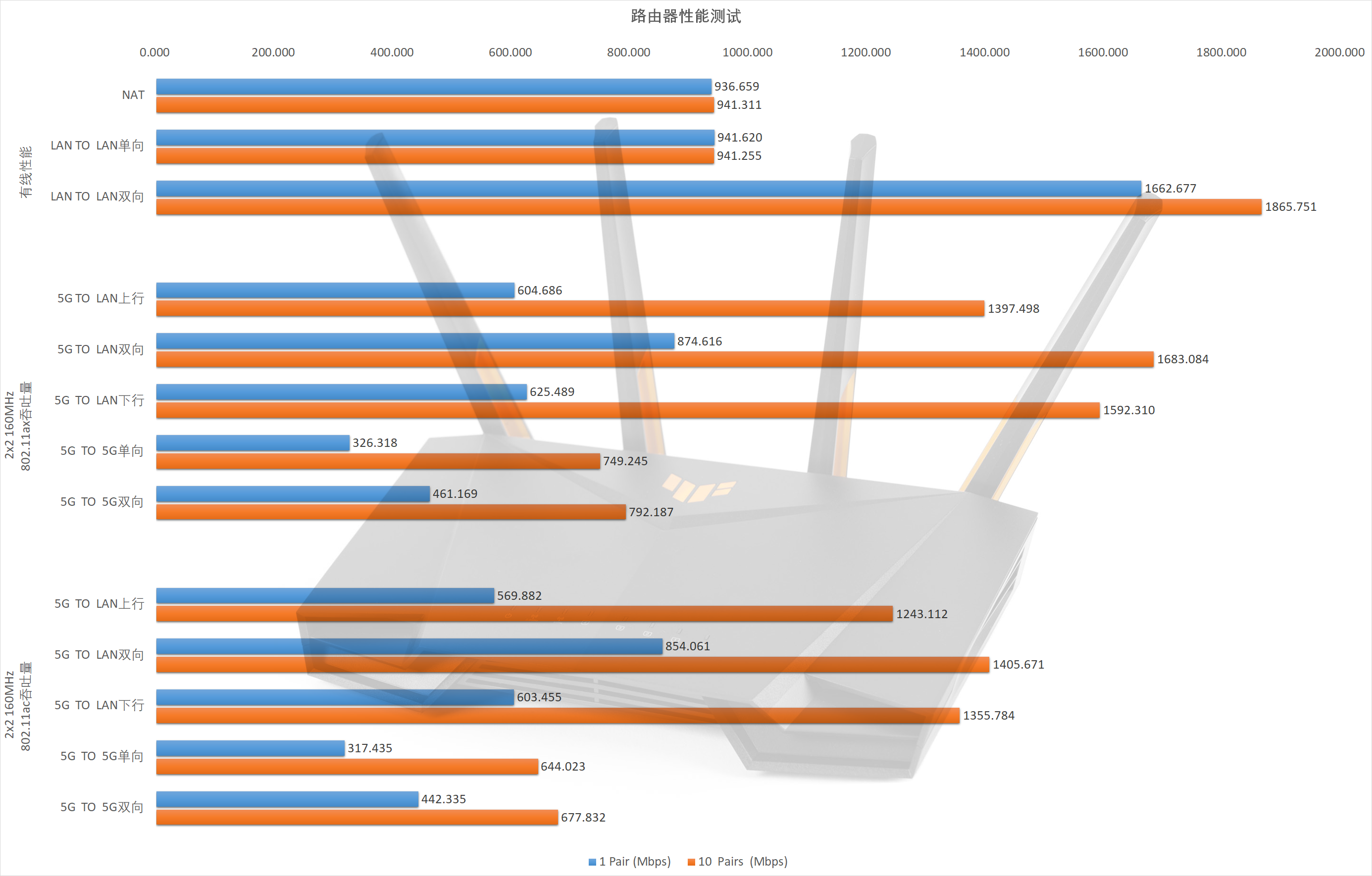 ▲NAT单线程和十线程 ▲LAN to LAN单向单线程和十线程 ▲LAN to LAN双向单线程和十线程二、2x2 160MHz 802.11AX吞吐量测试