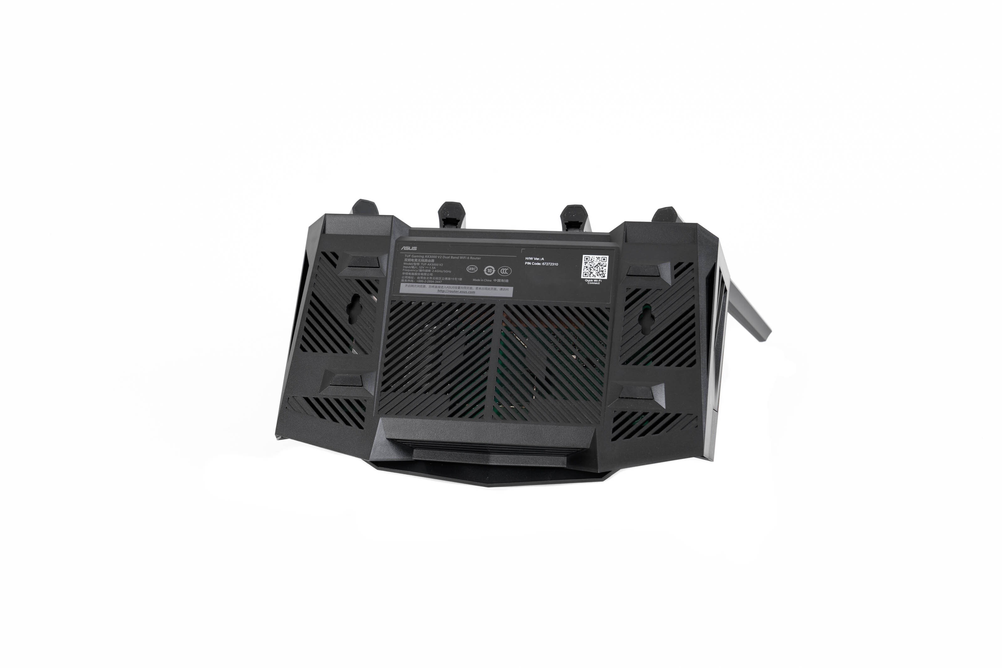 ▲包装盒采用扁平设计,可以看到新的TUF GAMING AX3000 V2引入了2.5GbE网口 ▲包装盒背面阐述了TUF GAMING AX3000 V2的特点 ▲掀开盒盖可以看到内部的路由器和纸质文档,新手小白也可以快速配置使用 ▲路由器分布在盒底左侧,电源适配器和网线位于盒底右侧 ▲电源适配器规格是12V 1.5A,13W的功率 ▲随机附赠了一根6类屏蔽网线,线径26AWG ▲TUF GAMING AX3000 V2电竞路由器正面,路由器整体采用黄黑配色,顶部做了V字型开孔,有利于内部热量散出 ▲将天线竖起,天线采用不可拆卸设计,在长久的使用过程中能避免松动,保证稳定运行 ▲背面IO接口一览,从左往右分别是电源直流插孔,电源开关按钮,USB3.2 Gen1接口,四个千兆LAN口(其中LAN1口和LAN2口支持链路聚合),2.5GbE WAN口,WPS按钮,Reset按钮 ▲底部格栅设计,有利于散热拆解