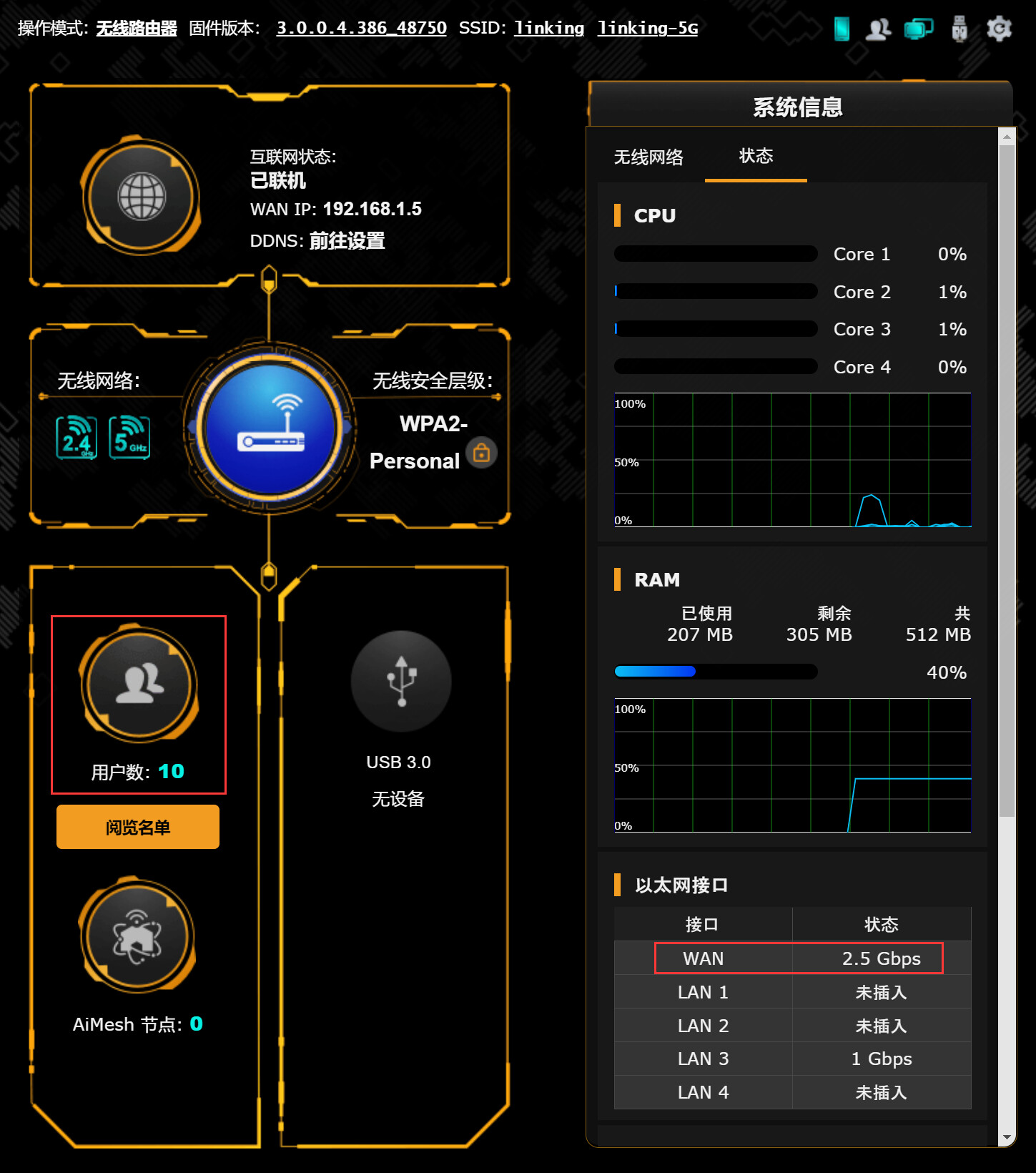 •带有1个2.5G WAN口,4个千兆LAN口(LAN1和LAN2支持端口聚合),1个USB3.0接口