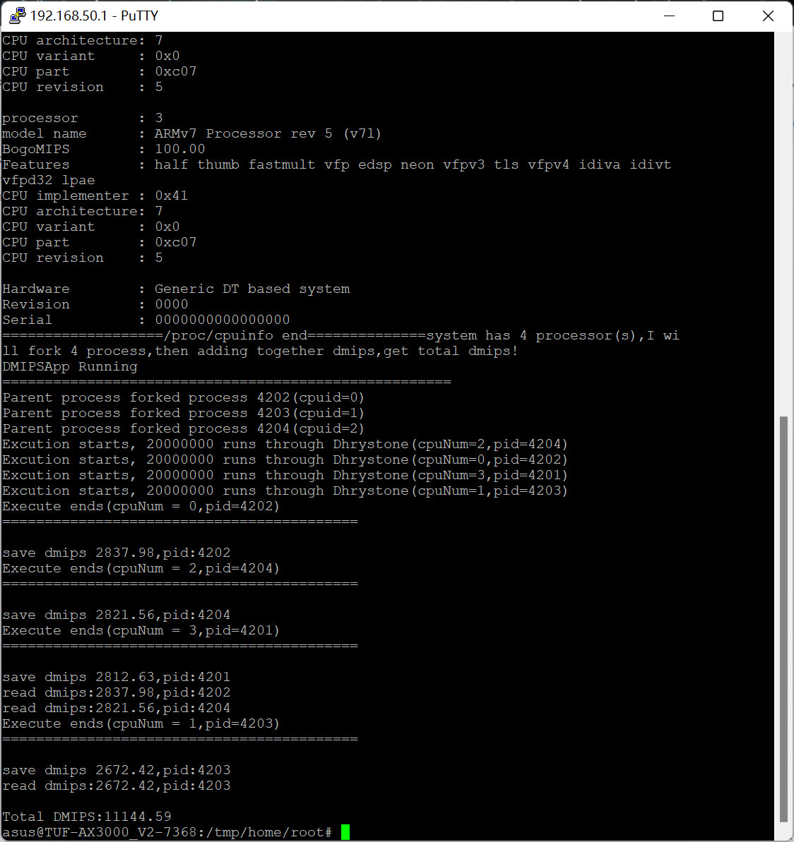 ▲使用dhrystone测试,DMIPS分数在11144.59 ▲openssl aes-128-cbc加解密性能,单线程测试(关闭硬件加速)得分为43824.45k ▲openssl aes-128-cbc加解密性能,单线程测试(开启硬件加速)得分为43843.58k;可以判断TUF-AX3000 V2的CPU没有aes指令集,自然无法开启硬件加速 ▲openssl aes-128-cbc加解密性能,4线程测试(关闭硬件加速)得分为129418.87k ▲openssl aes-128-cbc加解密性能,4线程测试(开启硬件加速)得分为129957.89k;可以看到TUF-AX3000 V2的CPU没有aes指令集信号测试