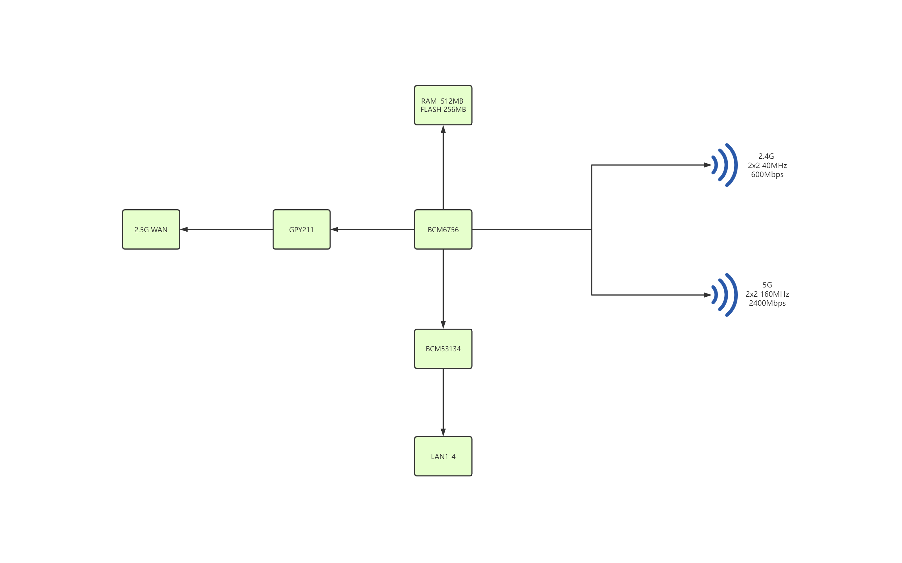 硬件•SoC:BCM6756,集成4核心ARM Cortex A7 CPU,1.7GHz主频;具有双802.11ax 两个空间流 (2×2) 160MHz WLAN 无线电