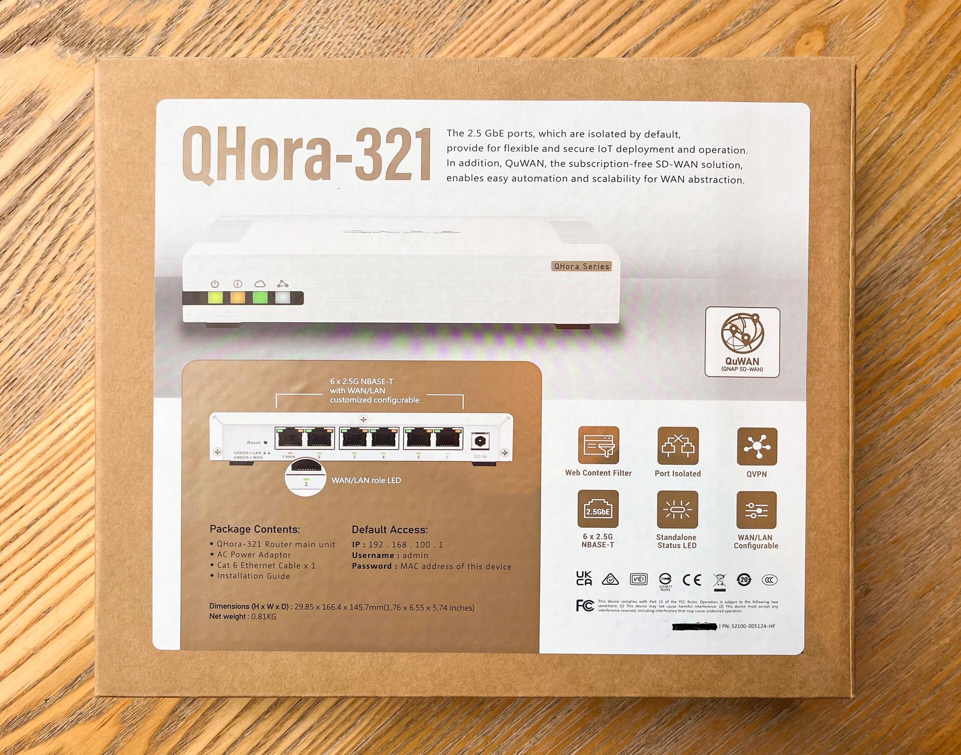 此次我们拿到的是QNAP QHora-321,外包装牛皮纸包装盒,QuWAN作为最主打功能在C位展示。