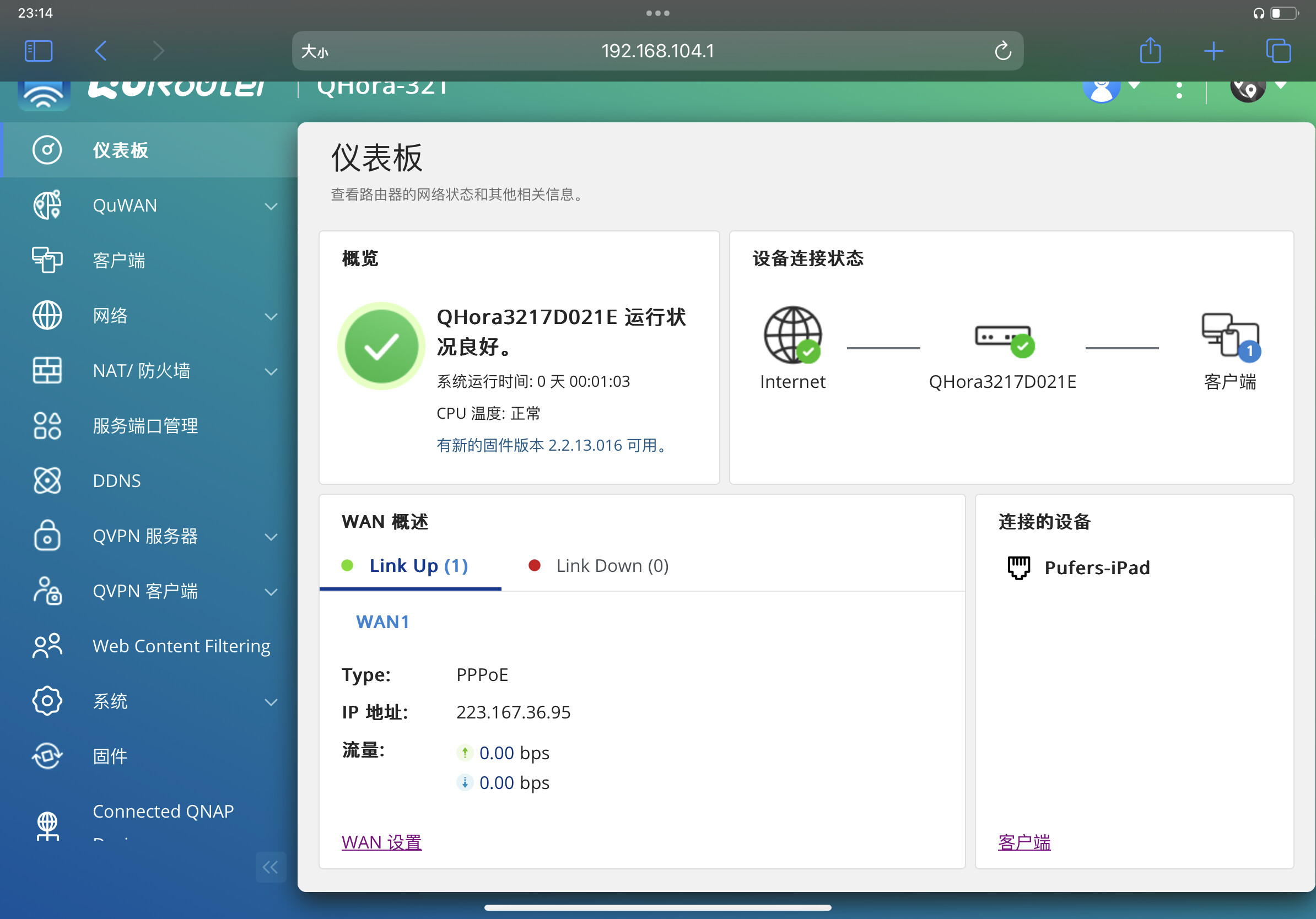 原厂固件的仪表盘,可以看到QHora-321工作状态和网络连接状态