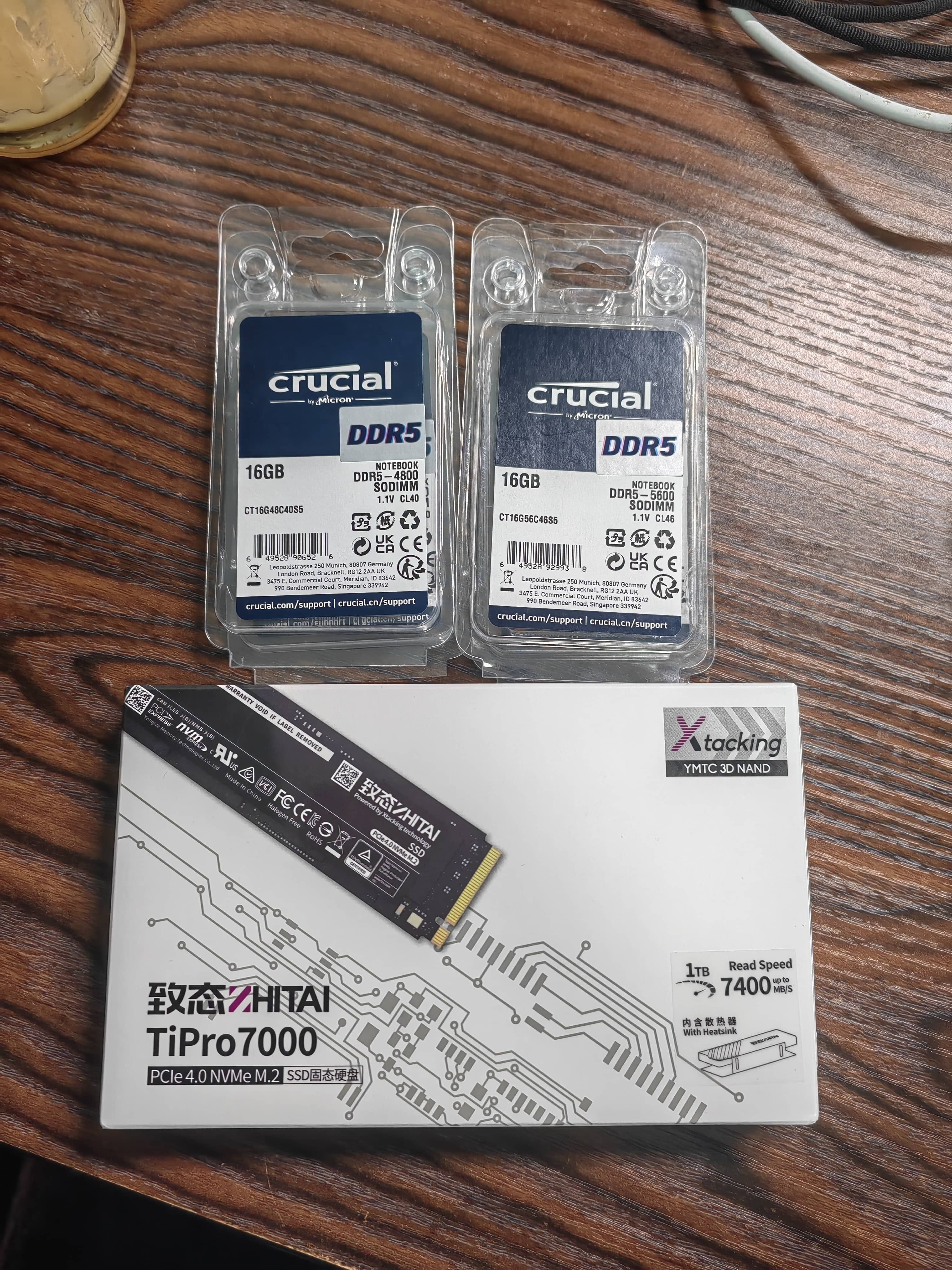 内存层面我最近选择了大热的两套Crucial的4800和5600的16G*2内存(PDD YYDS)。SSD则选择了国货之光致态(虽然长存目前进入了黑名单,未来的发展将举步维艰,但还是衷心地希望能够长长久久。Xtachking技术确实带来了优秀的带宽参数,用入门级别的配置就能做到中高端产品的性能。)。