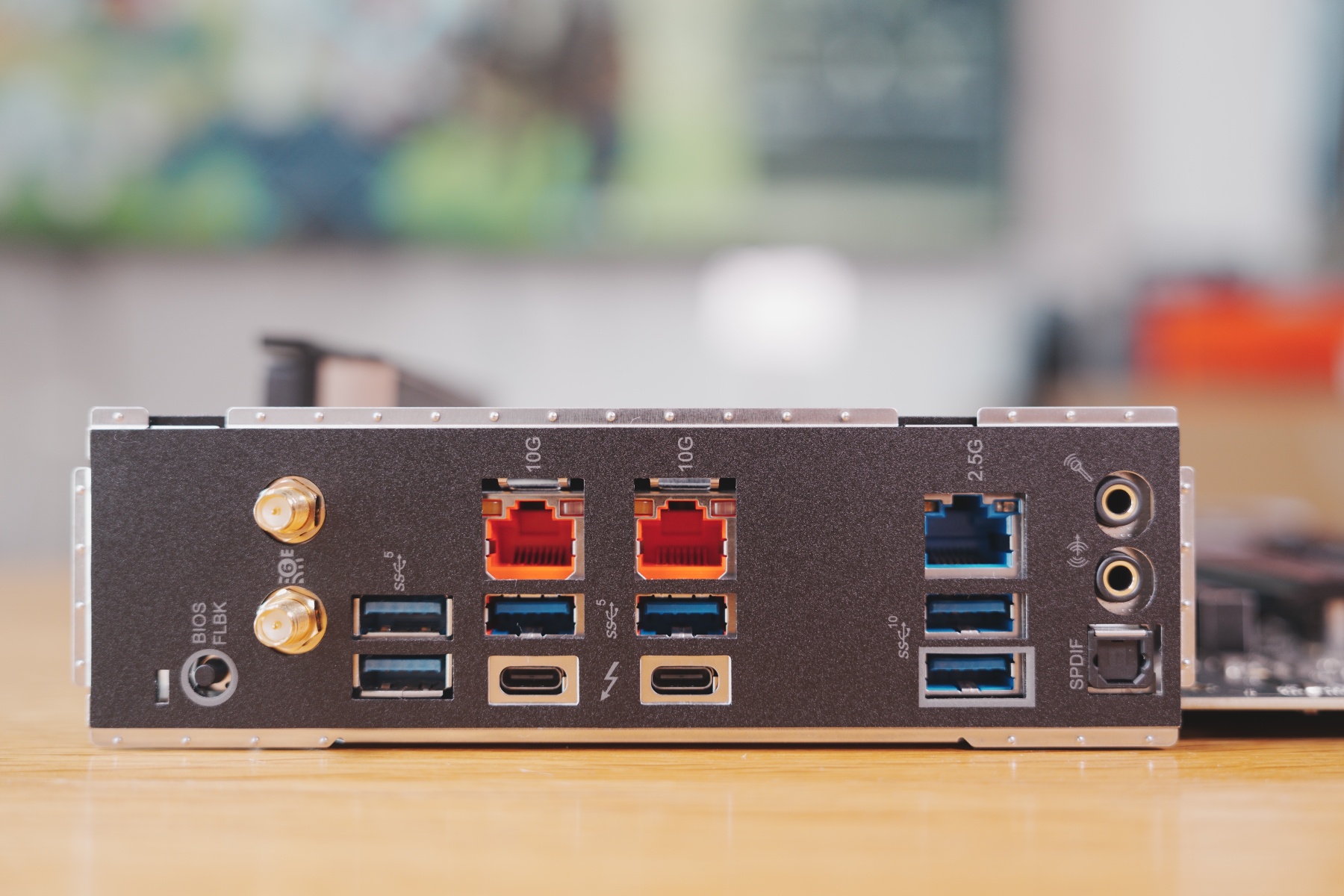 背部接口方面采用了一体化I/O挡板,除了拥有我们在桌面平台上常见的天线和USB接口以外,两个TYPE-C均为雷电4接口,双10G+一个2.5G有线网卡的配置是任何桌面级主板都没有过的。