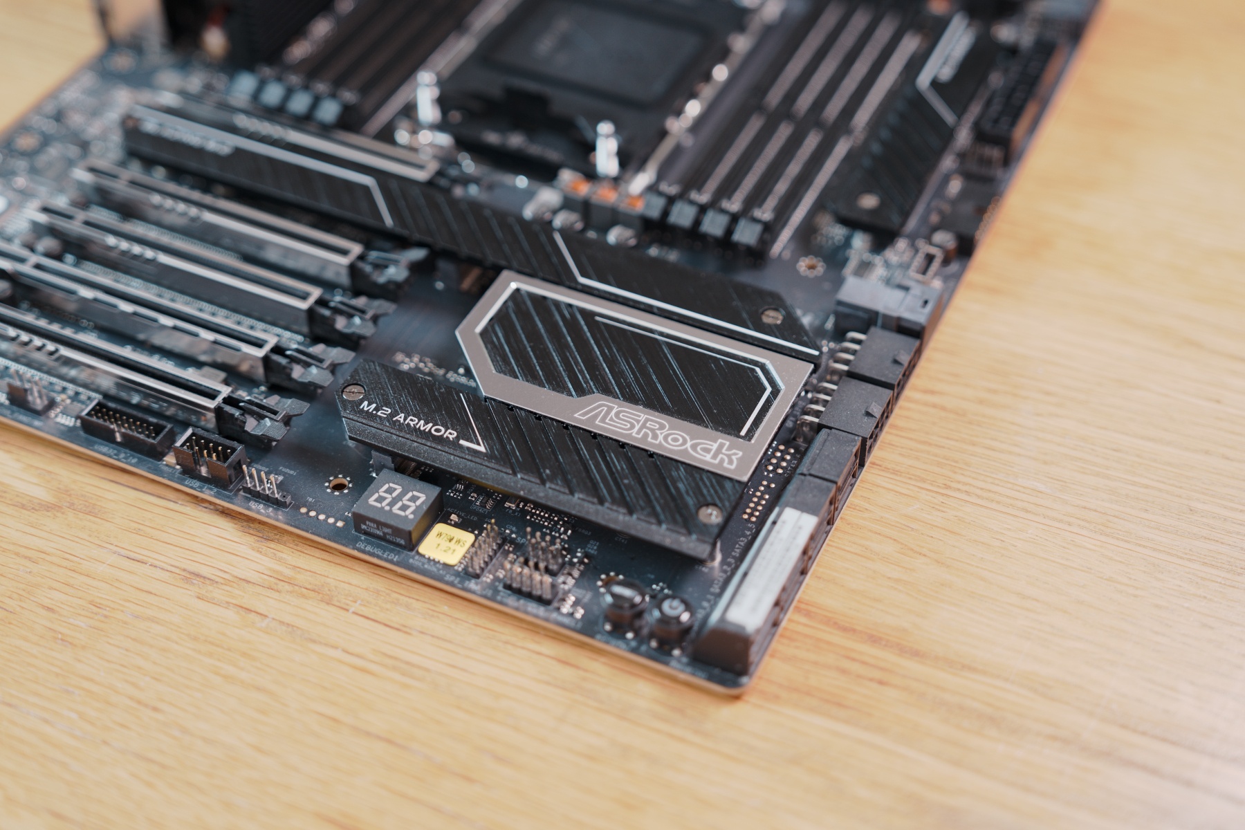 与大部分高端桌面主板一样,华擎W790 WS的M.2、PCH、I/O接口部分都安装有金属装甲,起到散热及装饰的作用。