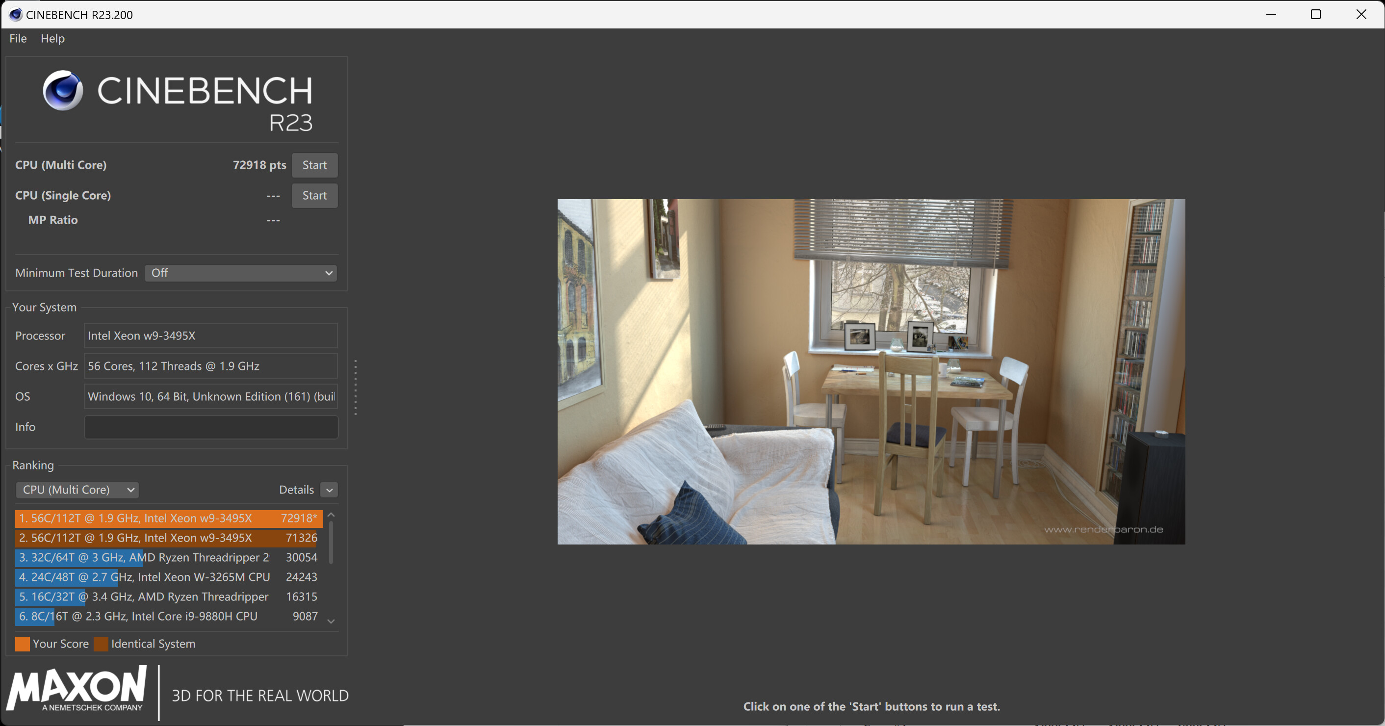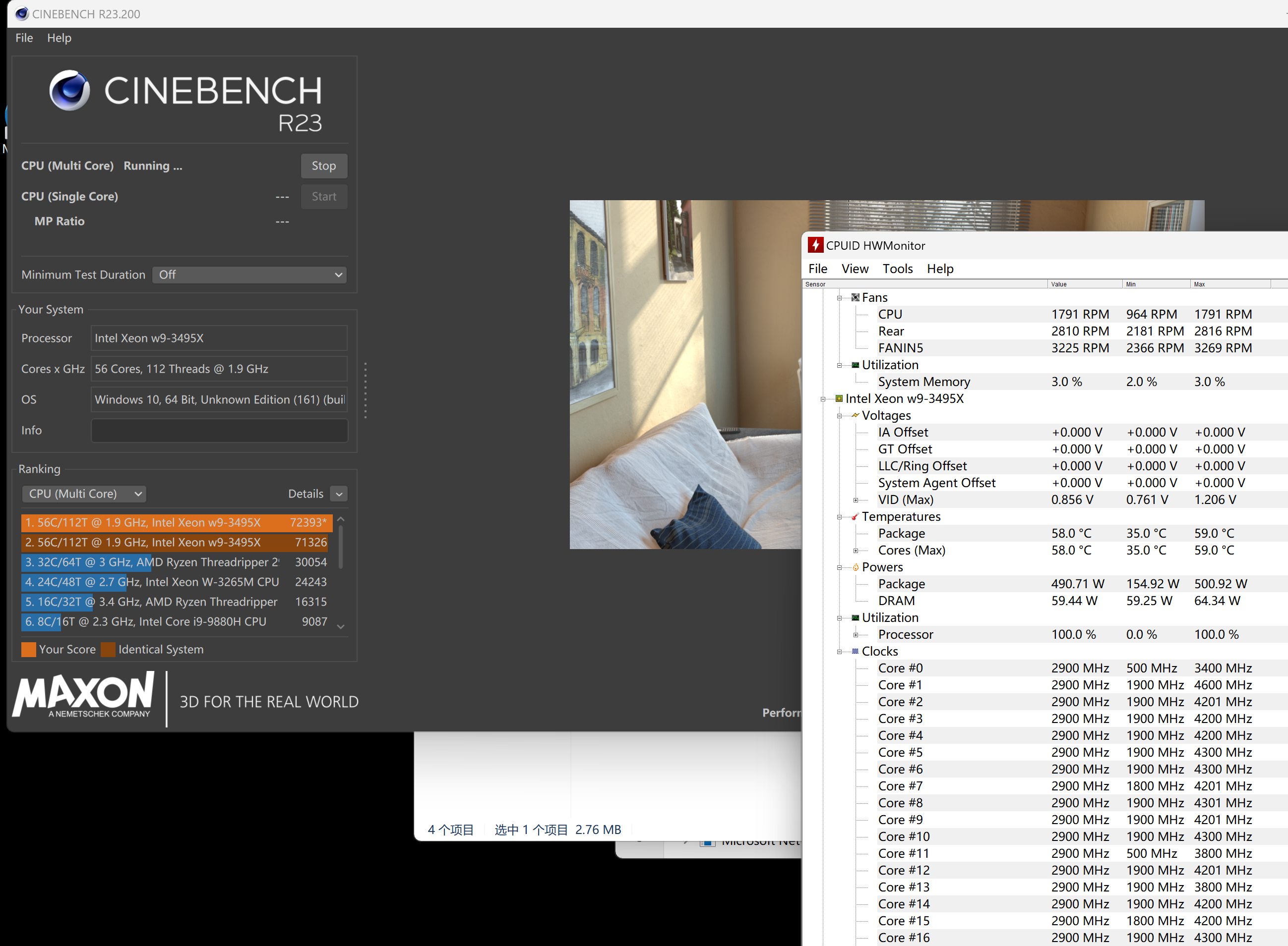 CinenBench的循环测试是在十分钟之内不停往复,按照W9-3495X的超强性能差不多10秒钟就能跑完一轮,十分钟总共跑了差不多60轮。在十分钟的循环测试中表现的非常的稳,功耗可以一直保持在500W功耗,仅有在每个循环之间的缓冲时间才因为负载较低功耗。