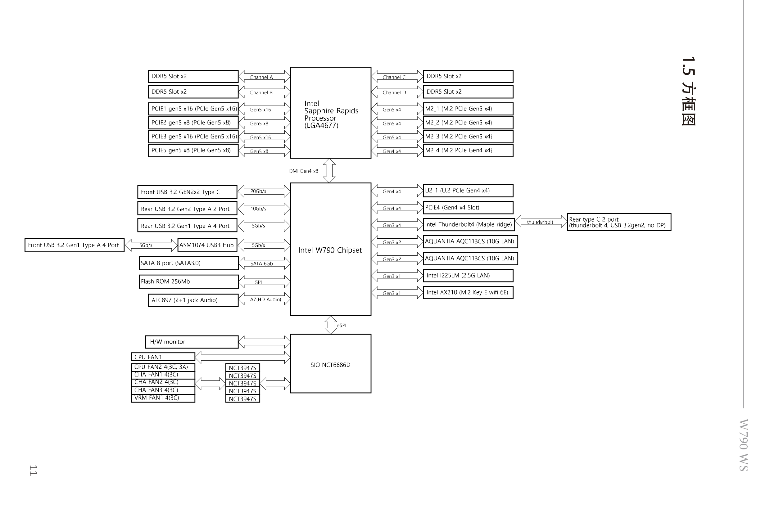 从官方给出的结构图来看,4个M.2全部直通CPU,支持PCI-E 5.0,一个U.2来自PCH。四个直通PCI-E插槽加上4个M.2,总共16+8+16+8+4*4=64 通道,正好满足Xeon W-24XX的规格。虽然W790WS提供了8条内存插槽,但实际上只支持4通道内存,每通道2dimm。这同样也是Xeon W-24XX的规格。由此可见W790 WS是一款针对Xeon W-24XX设计的主板,同时兼容W-34XX,只不过使用W-34XX会导致CPU的内存通道和PCI-E通道被浪费掉。
