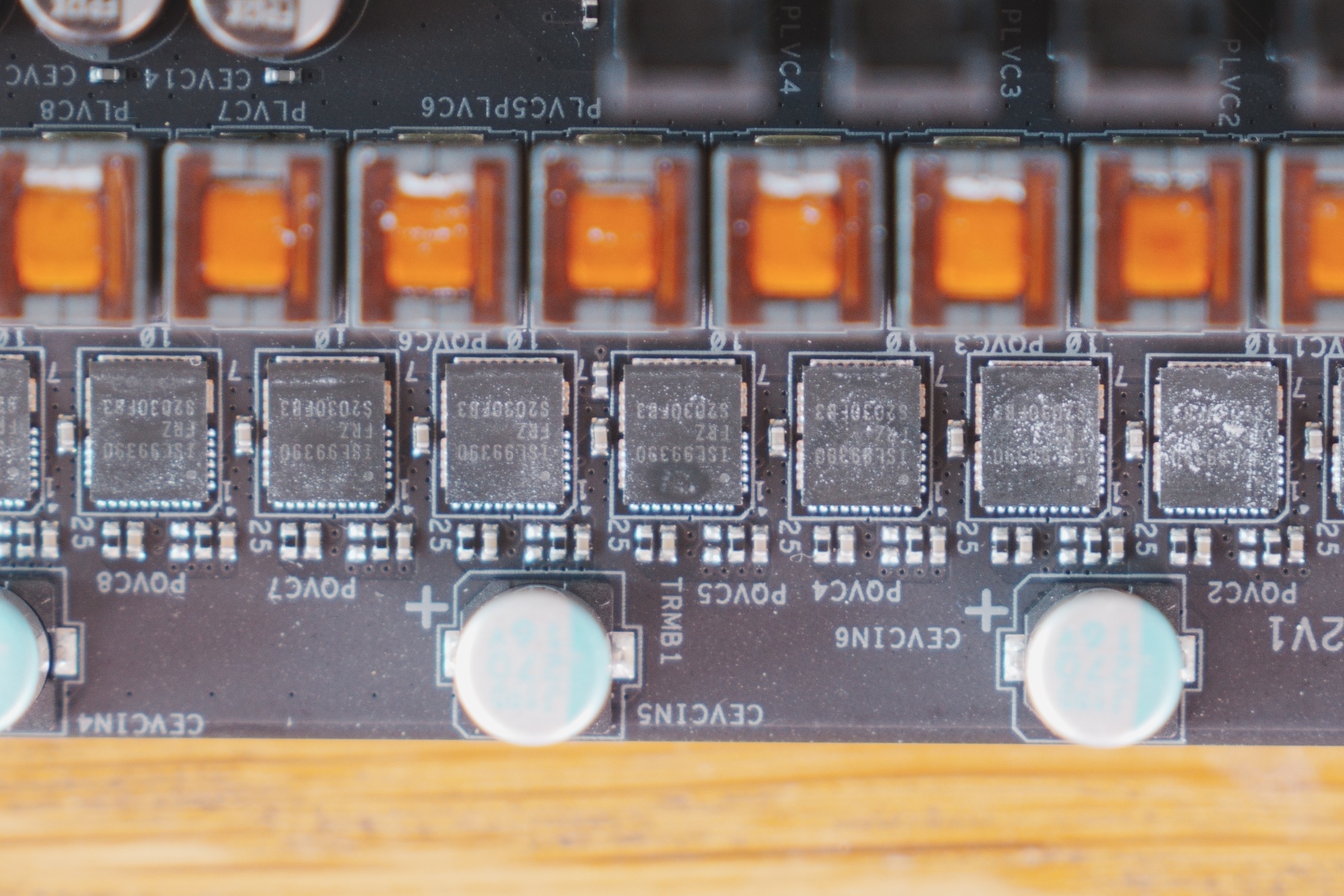 MOSFET采用ISL99390 Smart Power Stage,这是一款90A的Dr.Mos。理论上每相可支撑100W功耗,总计可对CPU提供超过2000W澎湃电力支持