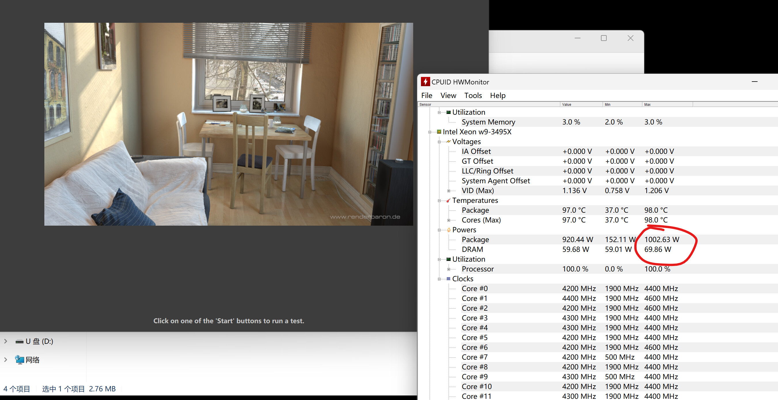 虽然功耗高的吓人,单CPU就可以干倒一枚1000瓦白金电源,但是超频的收益还是挺可观的,经过一番操作全核心性能可以提升50%以上。相比之下13900K那点超频幅度基本上等于没有了。而且W9-3495X的温度表现也非常优秀,比起13900K一般不和就上百的温度表现,W9-3495X搭配ABEE PLUS SPR360一体式水冷散热器,500瓦功耗下仅有60度,900瓦功耗下也能维持在90度。W790 WS搭配新一代XEON W处理器在超频方面有着非常高的可玩性。