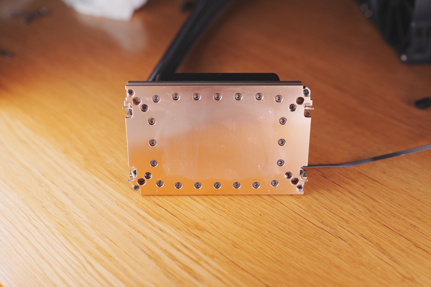 纯铜冷头接触面使用铜底原色,虽然没有进行抛光,但也打磨的非常平整。由于先前上机测试了一下,故而留下了轻微的硅脂痕迹。