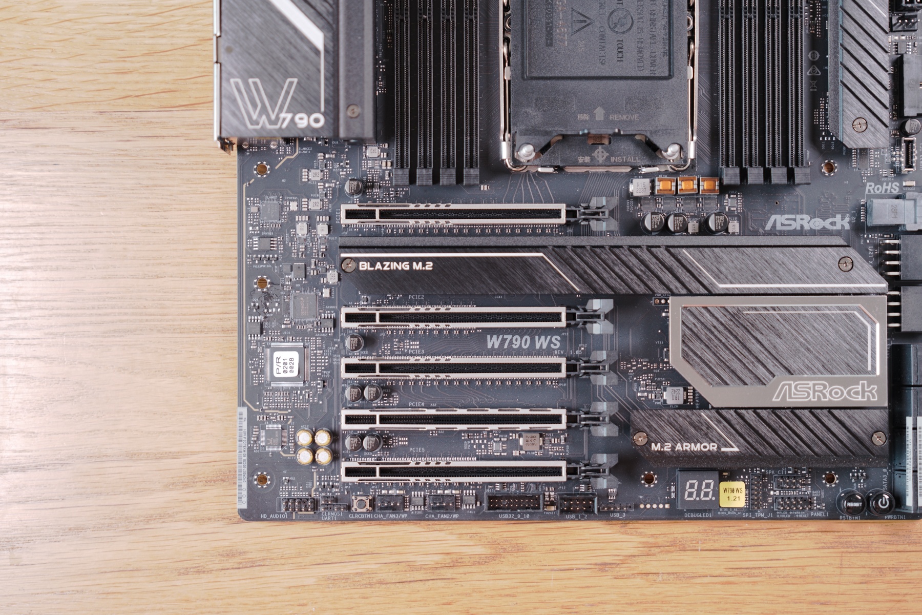 W790 WS有五个全尺寸PCI-E插槽,我们可以看到从下面数第二条那个装甲和其他四条不一样,这条插槽是挂接PCH的,仅有4.0 X4带宽。其余四条均为直通CPU的PCI-E GEN5,自上而下带宽分别为X16,X8,16,X8,故而PCI-E设备应优先使用这些接口。