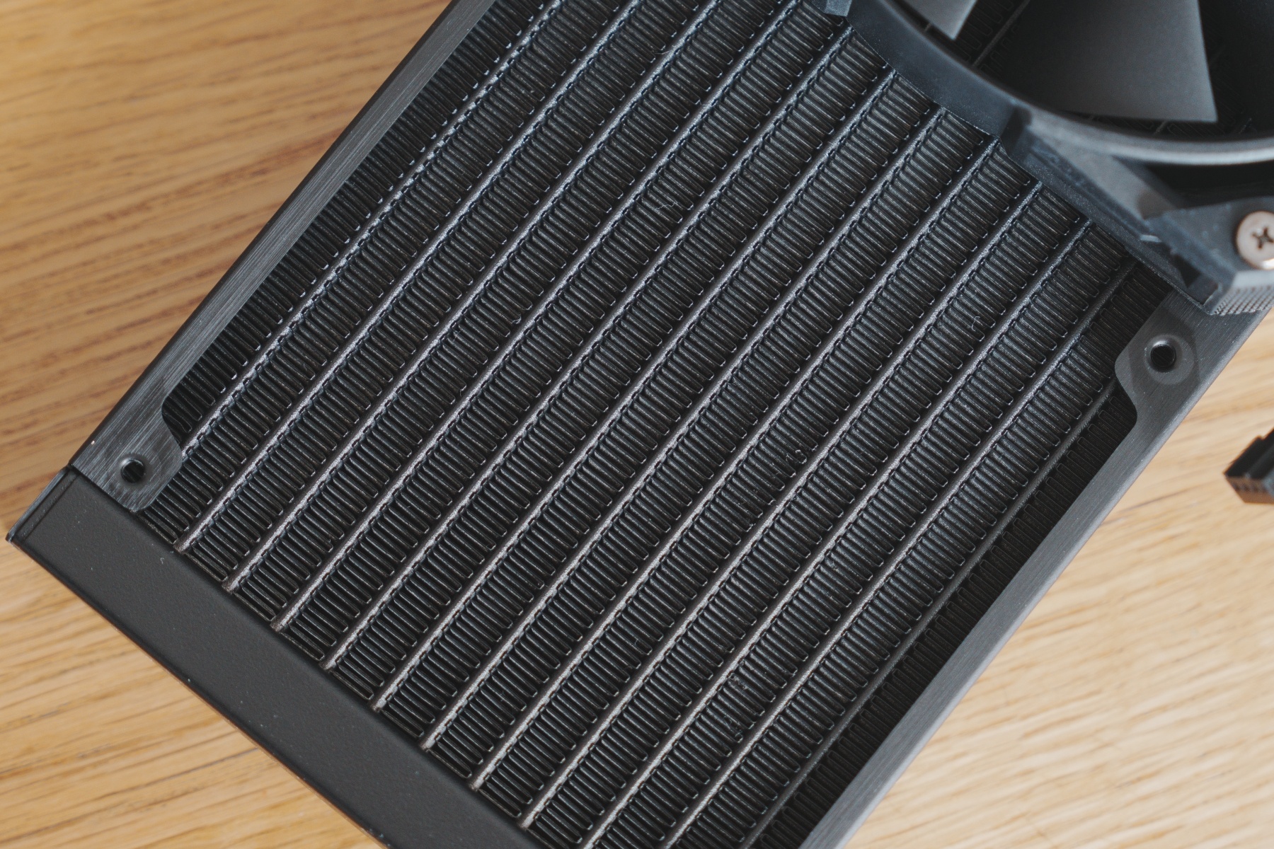 冷排为铝制,这也是目前一体式水冷方案的通用做法,想要铜排的只能自组分体水了。另外冷排鳍片密度很高,需要风扇提供较强的风压。