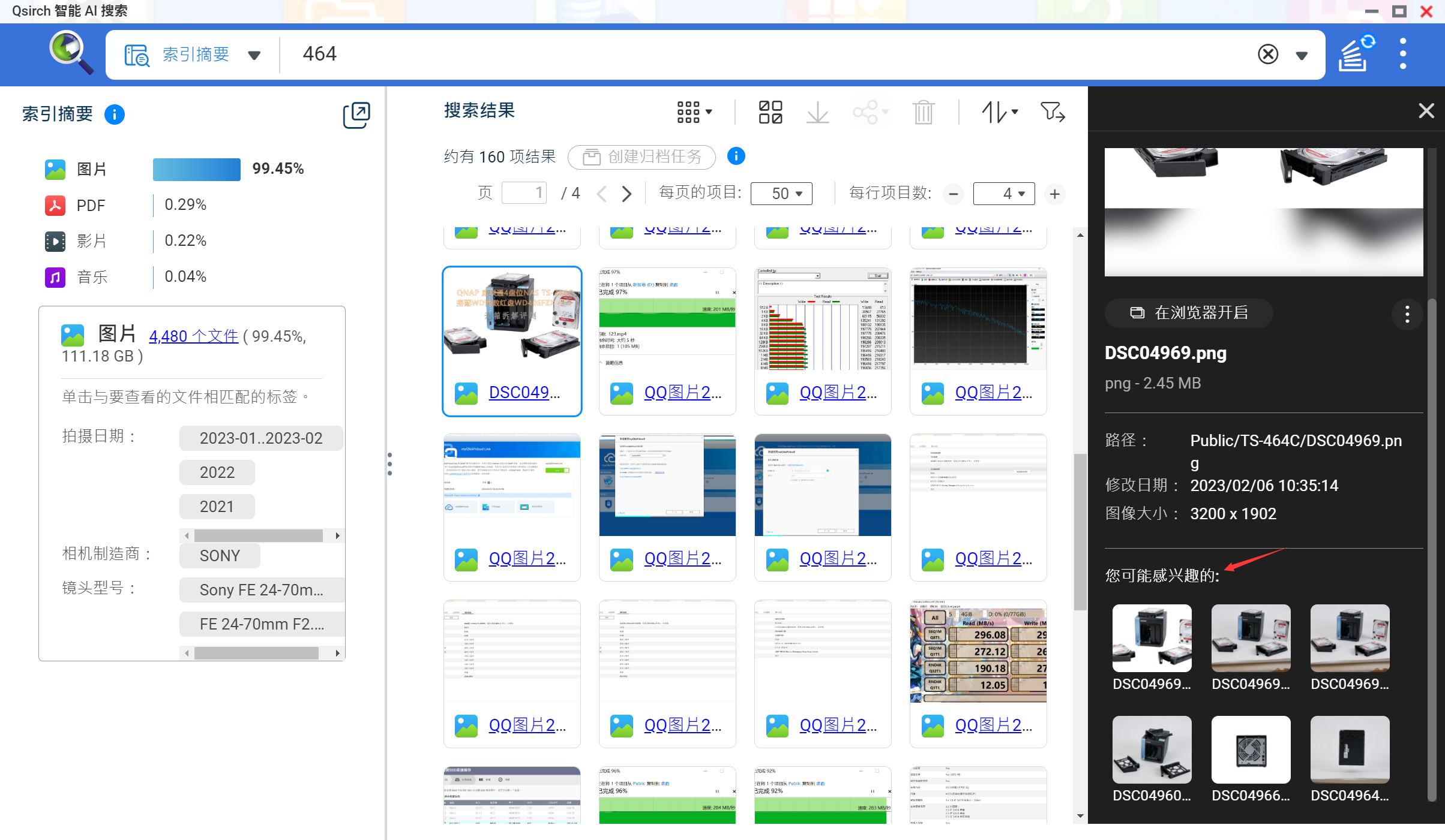 ▲Qsirch是QNAP NAS专属的全文搜索引擎,让您透过文件名、内容以及后设数据 (metadata) 找到所需的文件。你可以通过浏览器、Qsirch手机APP、Qsirch浏览器插件,以及Mac Finder等接口,随时搜寻。Lite版本免费,Premium比Lite多了人像搜索 ▲Qsirch仅在首次执行检索时需要较长时间 ▲可以查看NAS中多种文件类型的比例,再搭配常用的标签快速查找 ▲Qsirch可以智能推荐相关文件,根据索引的关键词,在浏览页面中同步推荐「您可能感兴趣的文件」,缩短文件查找的时间 ▲使用图片进阶索引,在「颜色」筛选器中选择各种颜色来搜寻合意的图片 ▲Qsirch可以设定共享文件夹的搜寻权限;管理员可弹性新增或删除能被Qsirch搜索的特定共享文件夹,确保机密资料不被检索 ▲Qsirch还能依访问权限搜寻;Qsirch根据QTS所设定的使用者及共享文件夹权限提供搜寻结果,使用者只会搜寻到被授权的文件数据,确保个人隐私并有效防止机密文件外流 ▲Qsirch开放API文件供第三方应用程序与系统整合使用。在浏览器上输入以下连结即可浏览文件http://IP:PORT/qsirch/latest/apiQfiling