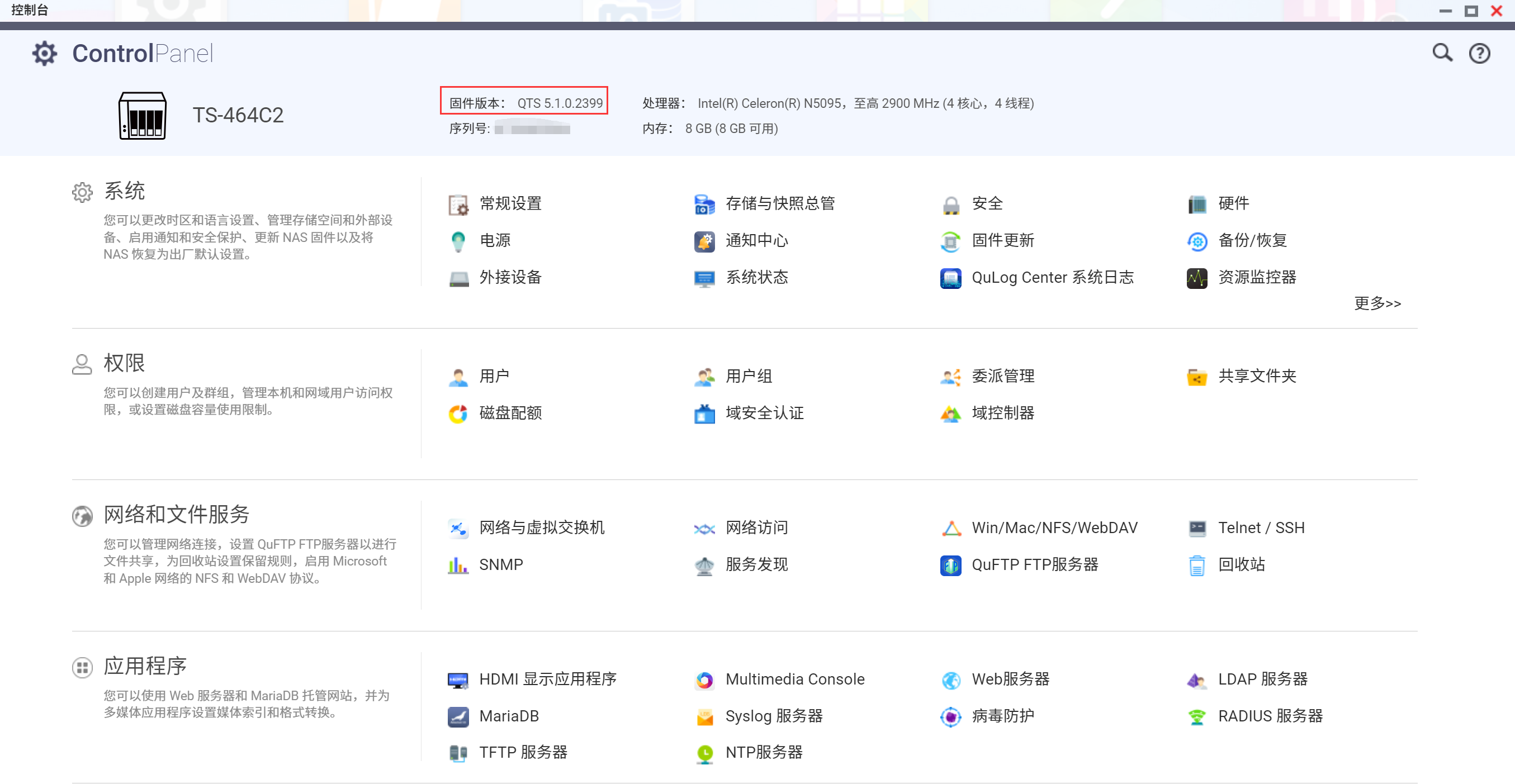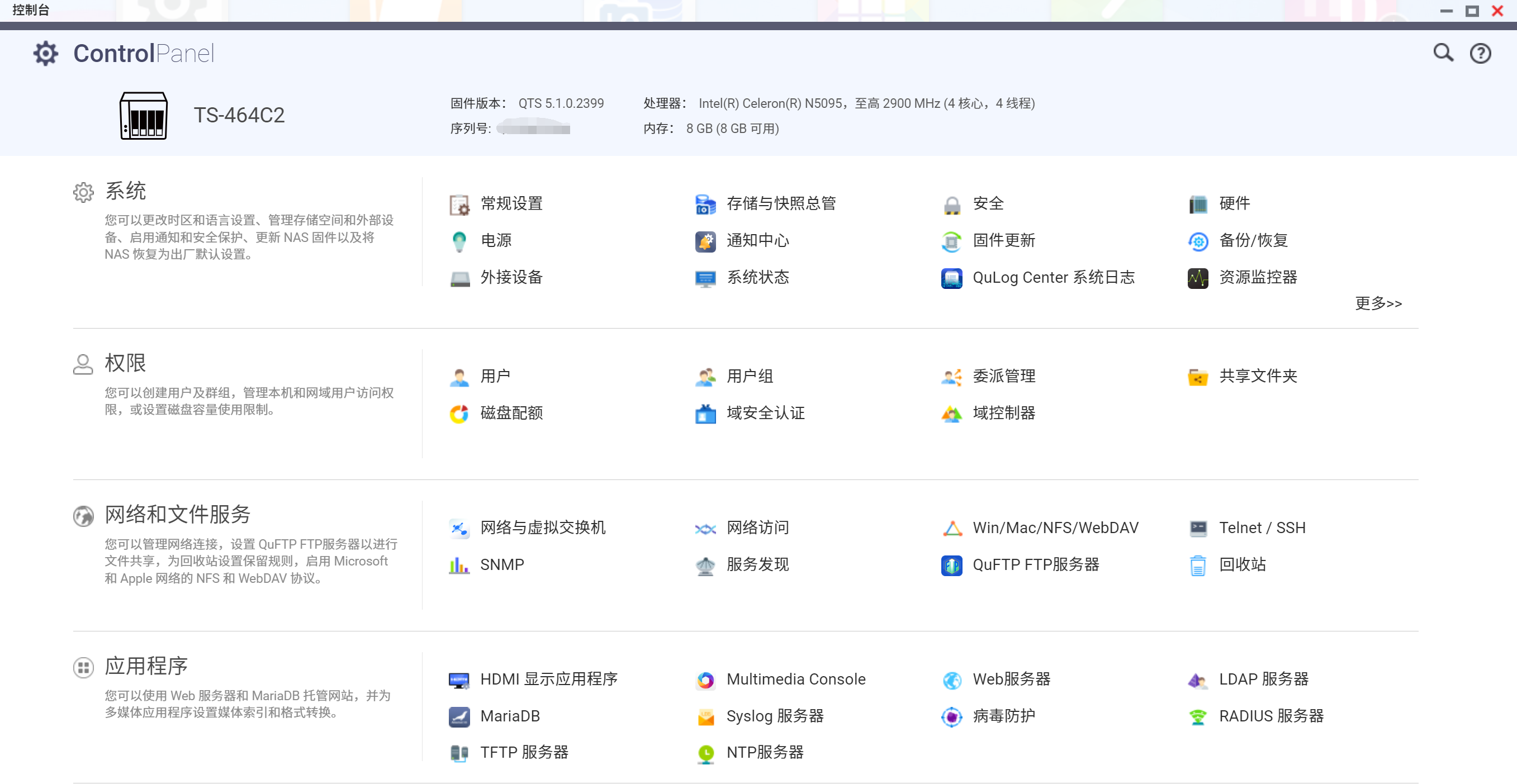 我们之前评测过QNAP TS-464C( 评测链接),这次来到koolshare评测室的QNAP TS-464C2搭载最新的QTS5.1.0系统,系统核心升级,由内而外焕然一新。支持SODIMM内存扩充,可弹性扩充上限达16GB;搭载Intel Celeron N5095四核心处理器,基础频率2.0GHz可睿频至2.9GHz;内置的2个2.5GbE RJ45网络端口支持SMB3.0(需要QTS5.1.0系统),整体传输性能倍数提升;配备的HDMI 2.0输出端口,能给用户带来4k的视频影音体验;下面来看看它的表现如何