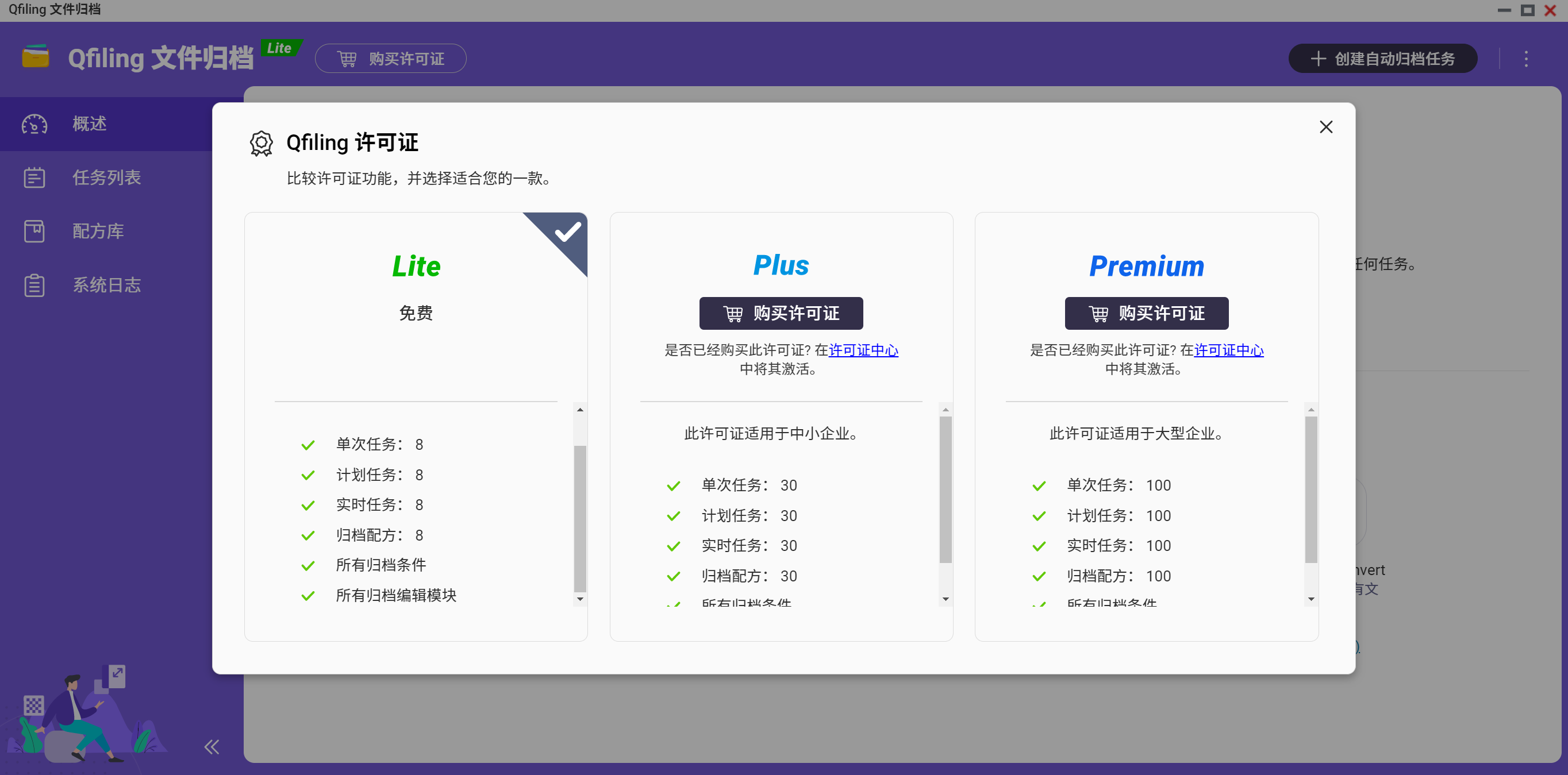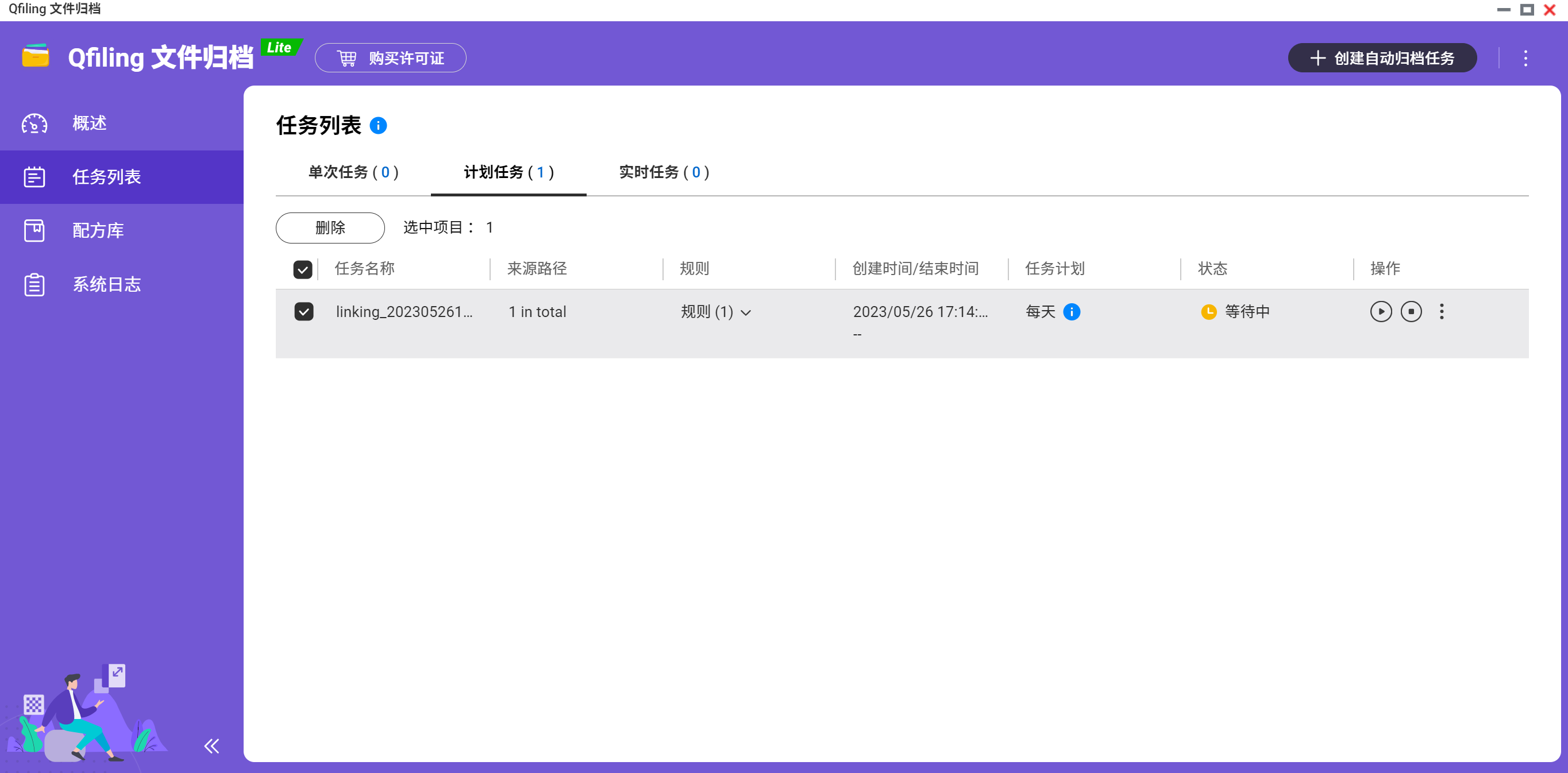 ▲Qfiling让文件整理工作变得自动化 ── 您只须要将文件分类并设定排程,剩下的就交给Qfiling处理。Lite版本免费,可以进行8个任务,Plus和Premium可以执行30和100个任务 ▲首先我们需要创建自动归档任务,因为文件归档结束后是存放到另外一个地方,如果为了节省硬盘空间可以选择归档后删除原来位置的文件单次任务:仅执行一次性存档任务