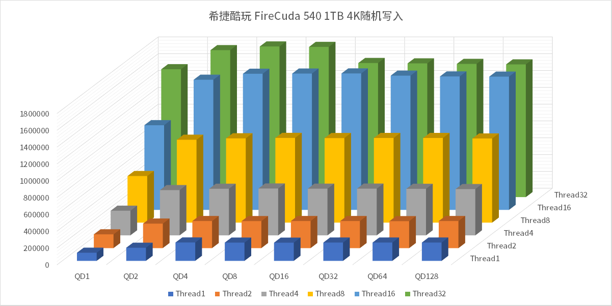 4K随机写入队列达到Q4T32时,IOPS达到峰值179万,相比CrystalDiskMark测出的161万还要高上不少。但如果保持Thread=32的情况下,将QD提高到16以上,性能反而有所下降。