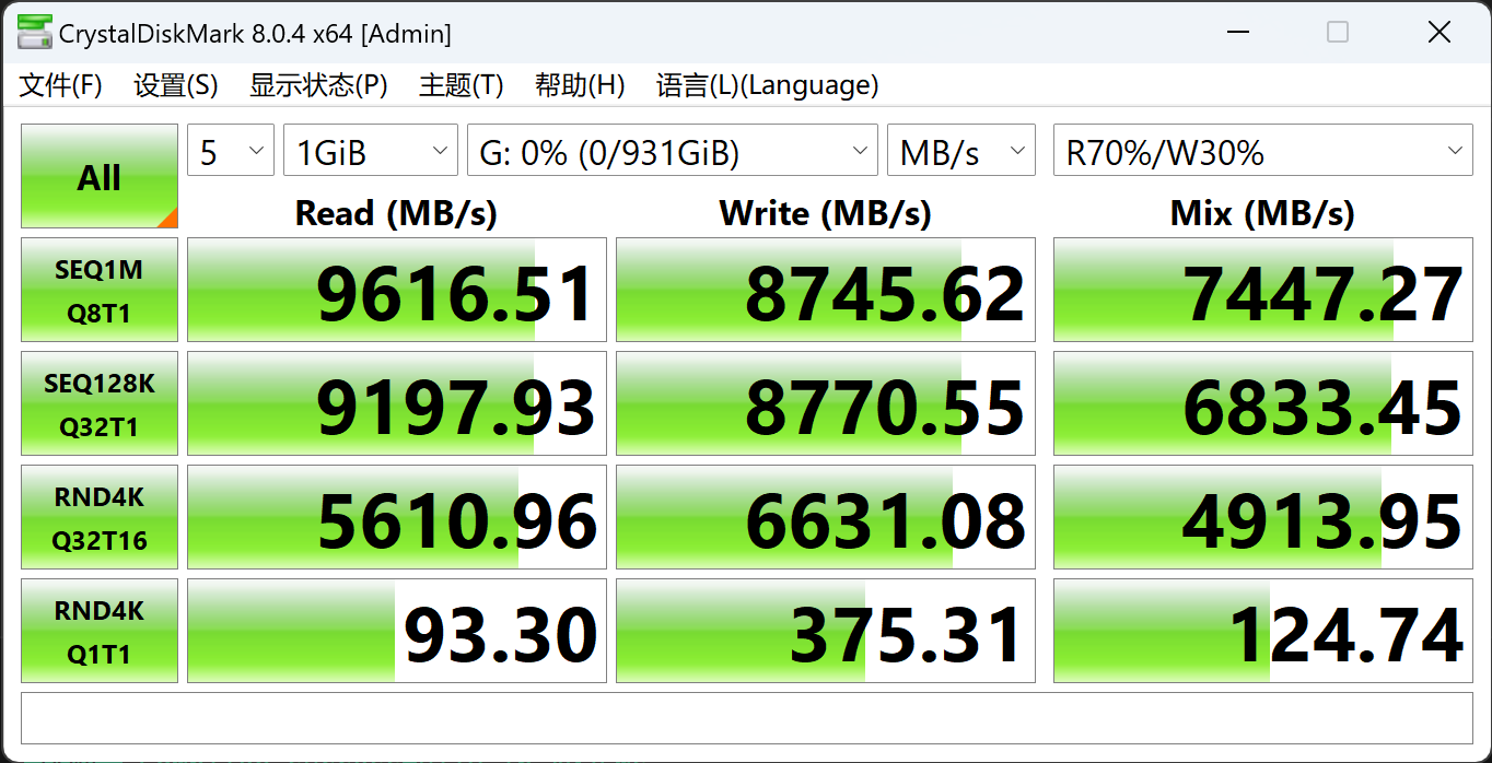 按照惯例,我们先试一下1GB跨度内的CrystalDiskMark测试,因为1GB正好在这块盘的独立DDR4缓存容量内,应该能跑到该盘的最佳理论性能。
