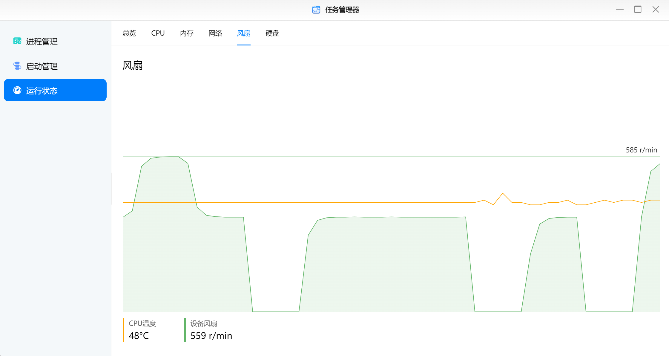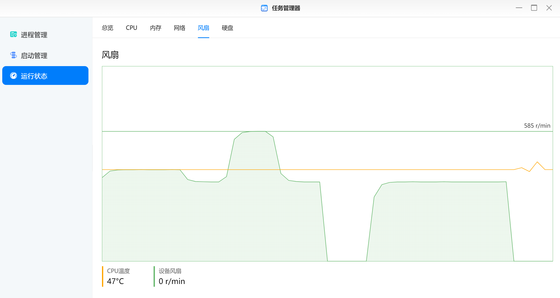 ▲风扇标准模式下支持启停,此时风扇转速在0-585RPM之间波动;此时CPU温度在47℃左右