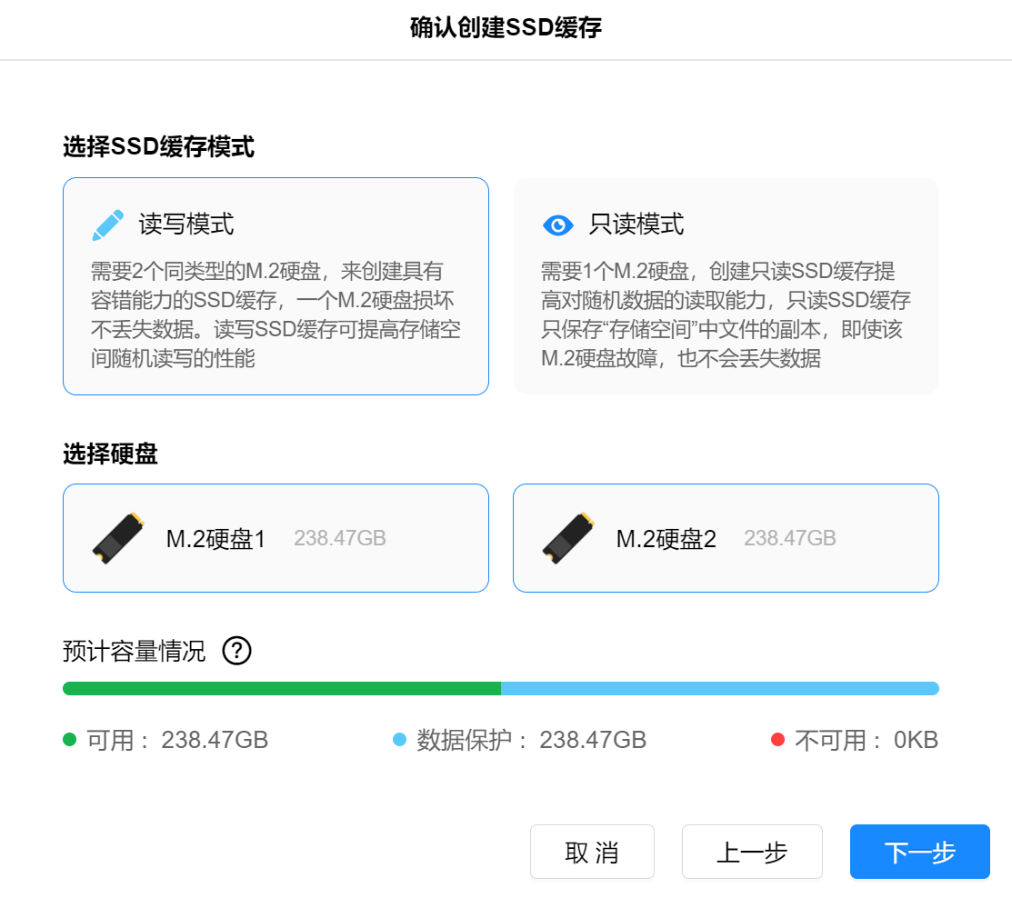 ▲如果使用SSD加速,在创建SSD缓存时可以选择读写模式或者只读模式(允许使用单块SSD)