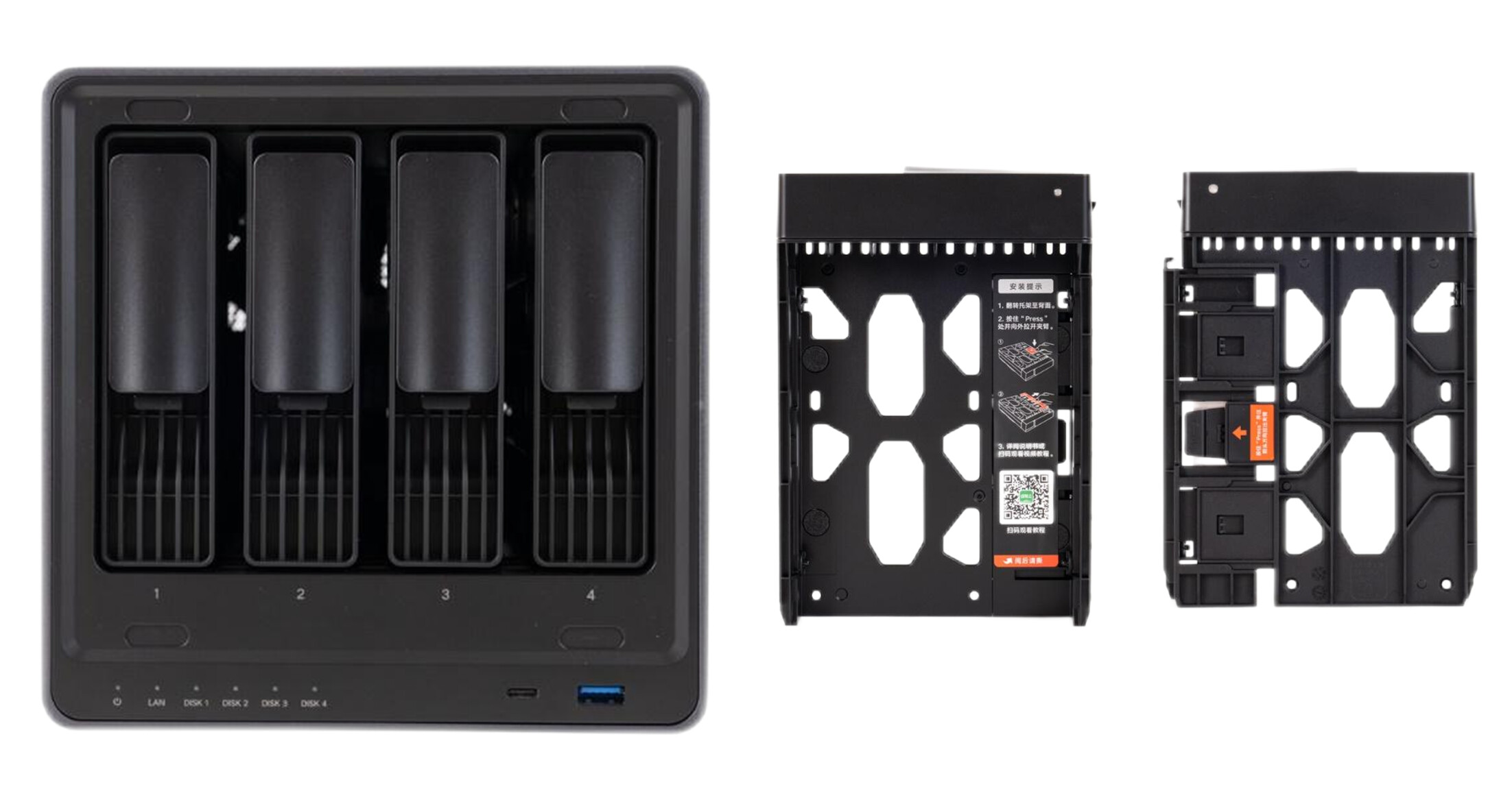 ▲硬盘仓采用四槽位设计,有四个抽拉式硬盘架,可以安装四块SATA硬盘。硬盘托架厚实,预留了2.5寸SATA硬盘的螺丝孔,可同时兼容3.5寸和2.5寸两种规格的SATA硬盘。硬盘托架采用侧拉设计,安装操作非常方便。