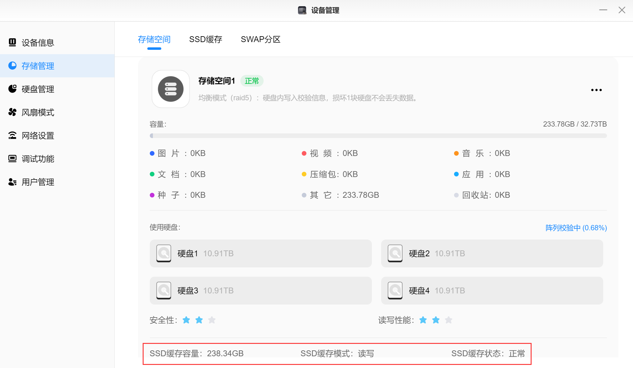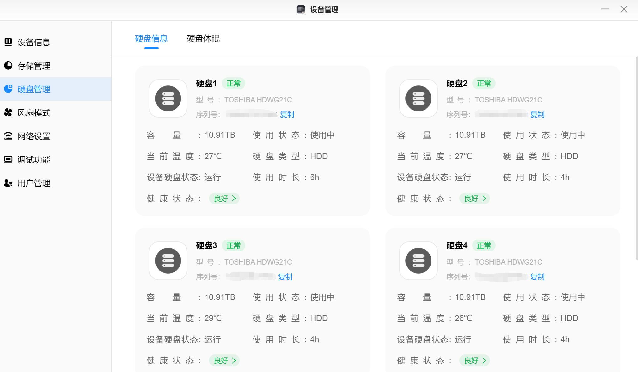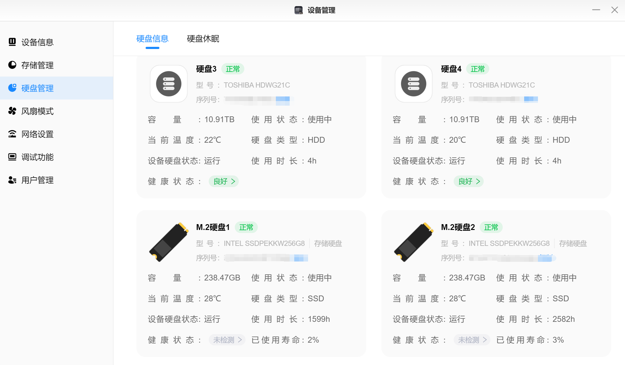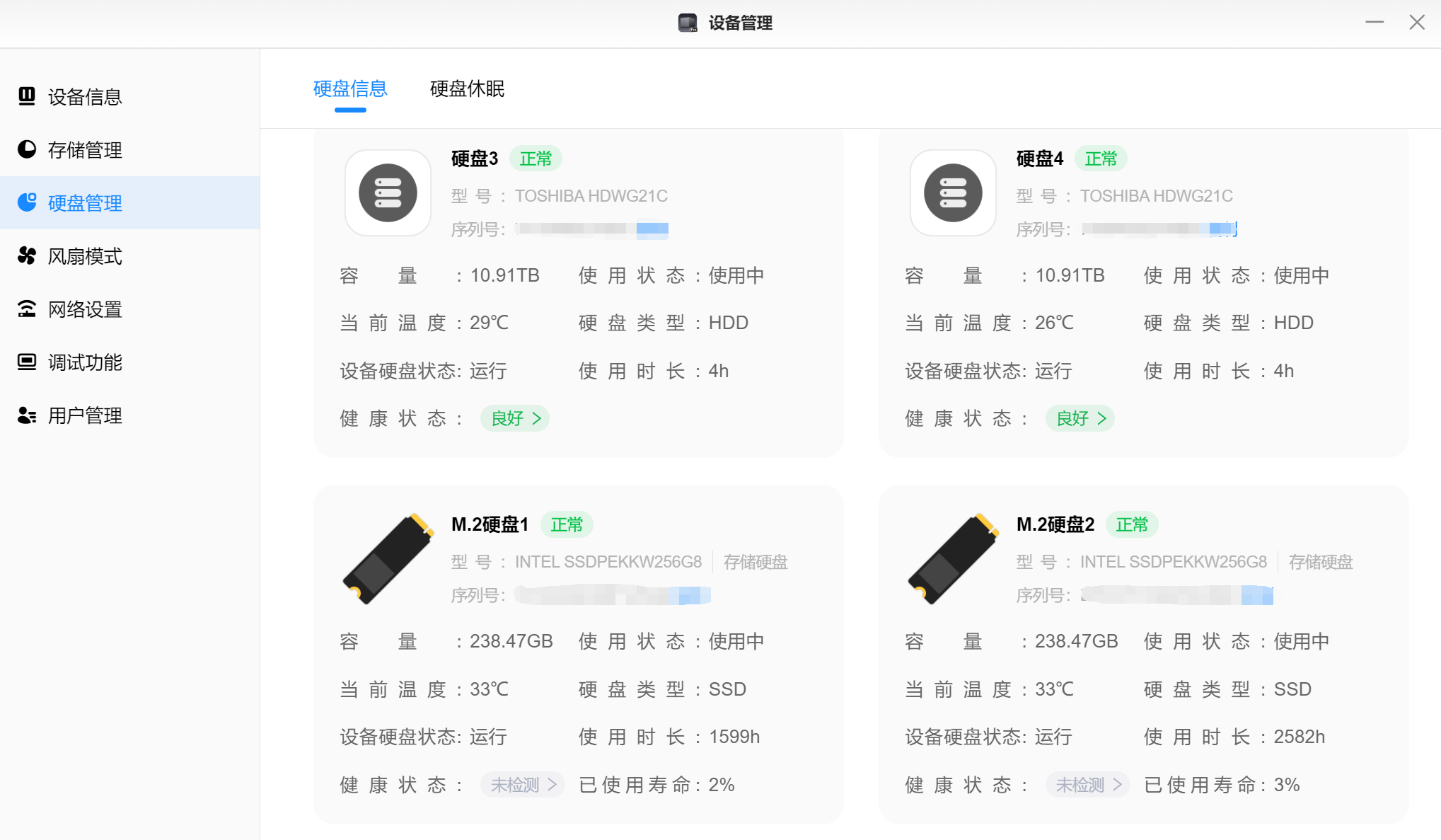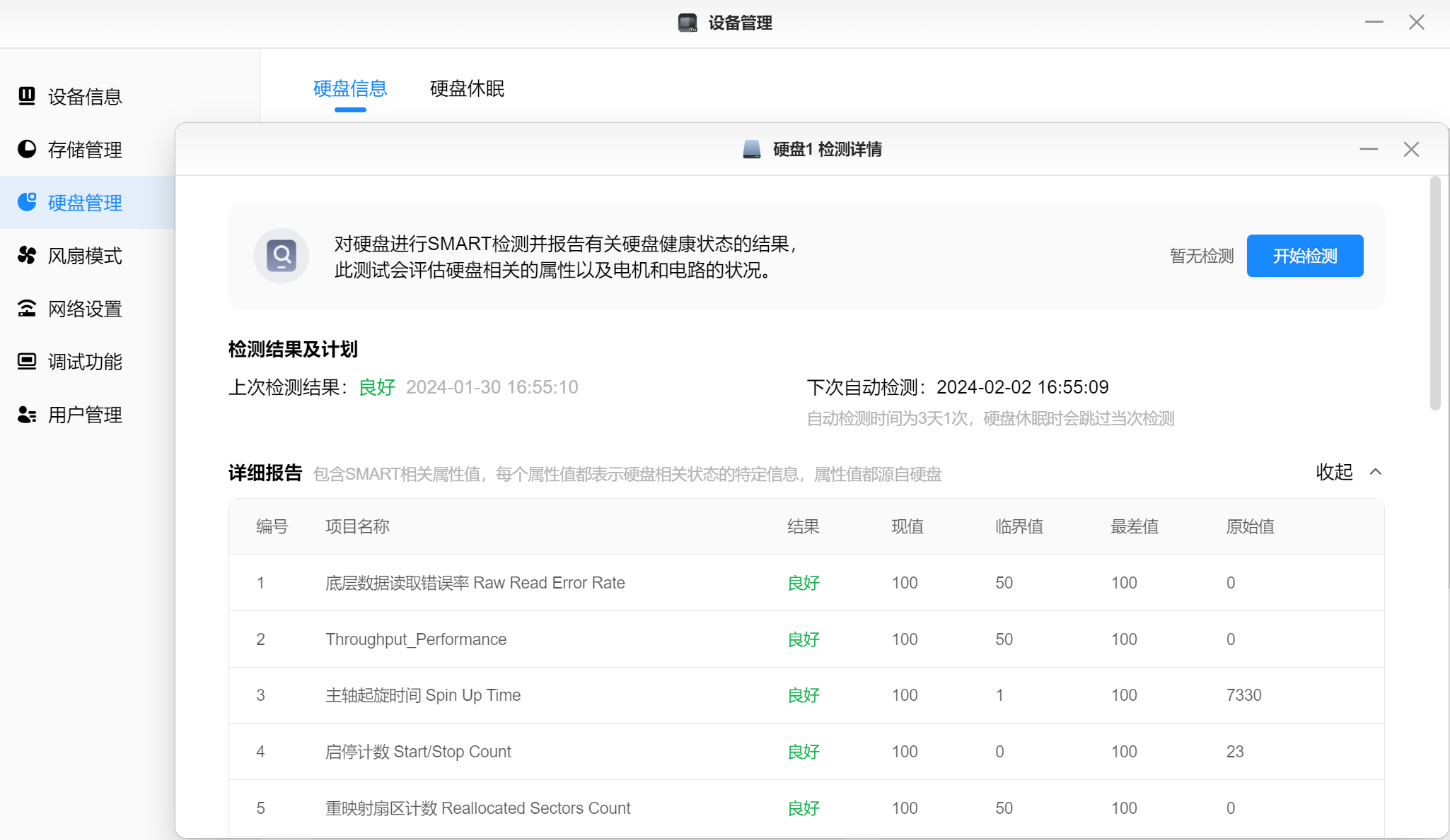▲硬盘管理页面可以对硬盘进行健康度检测,及时知晓当前硬盘健康状态