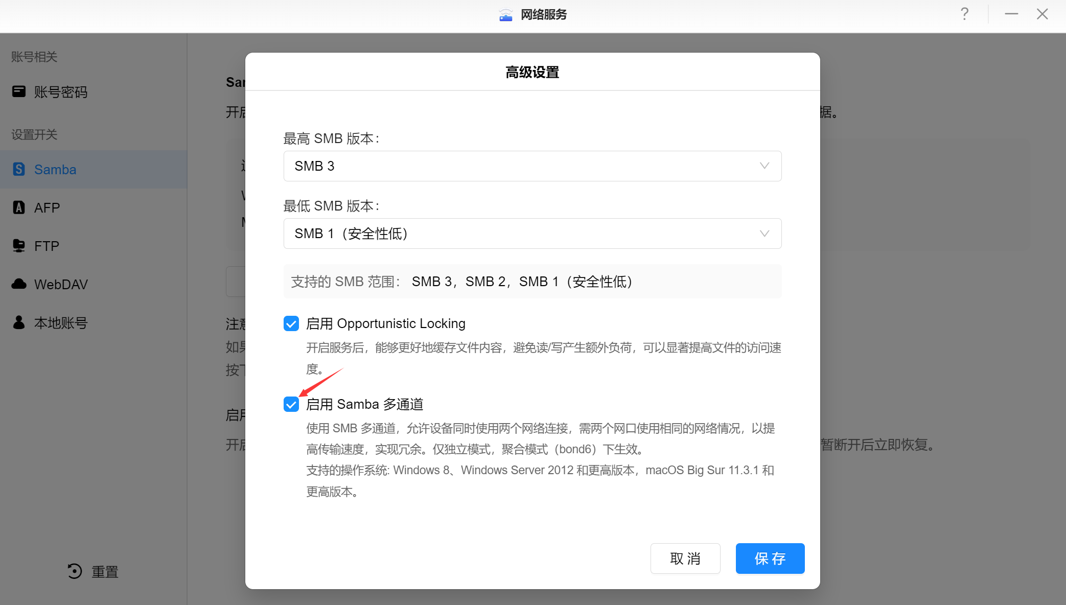 ▲Samba高级设置中可以启用Samba多通道