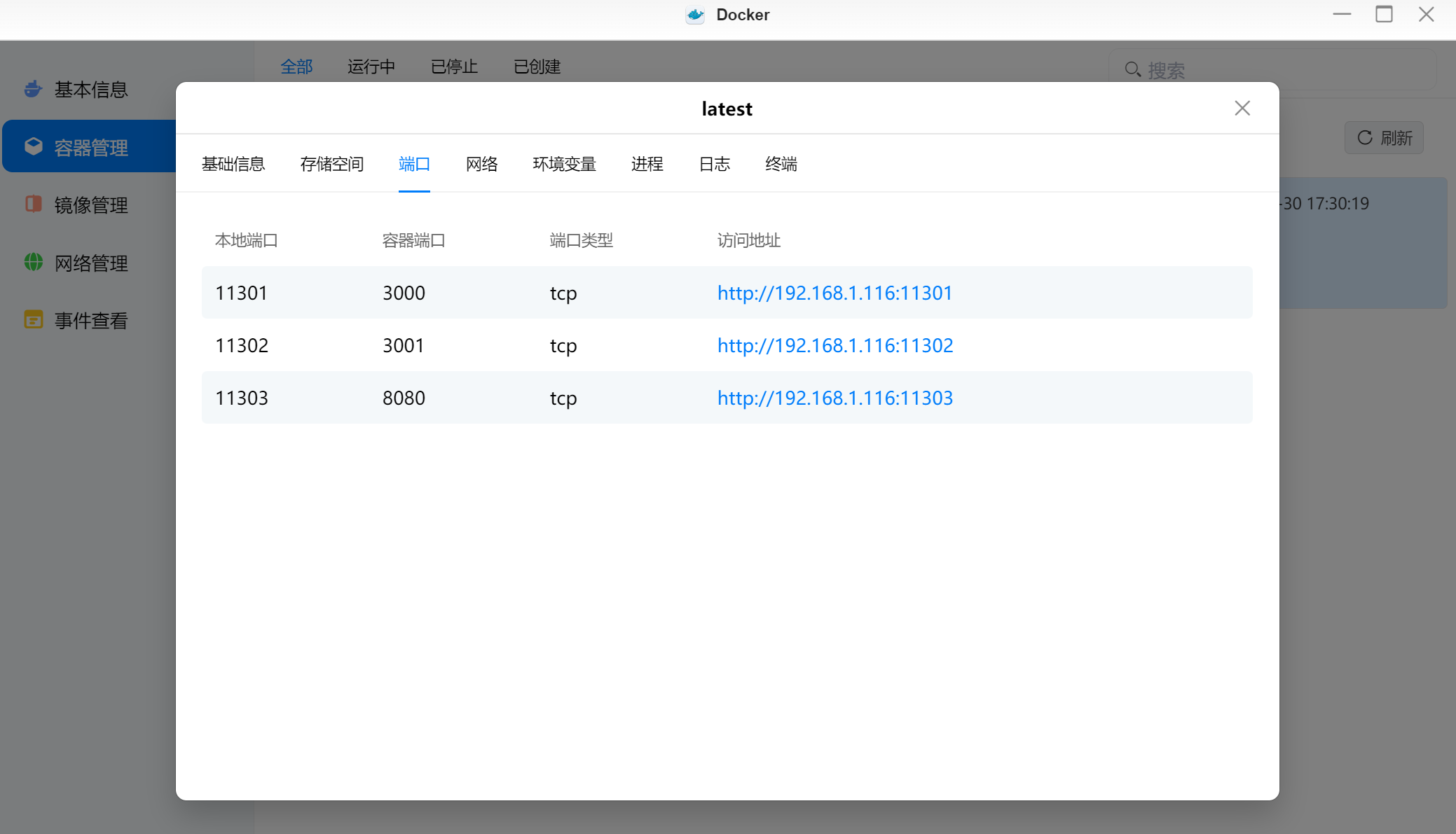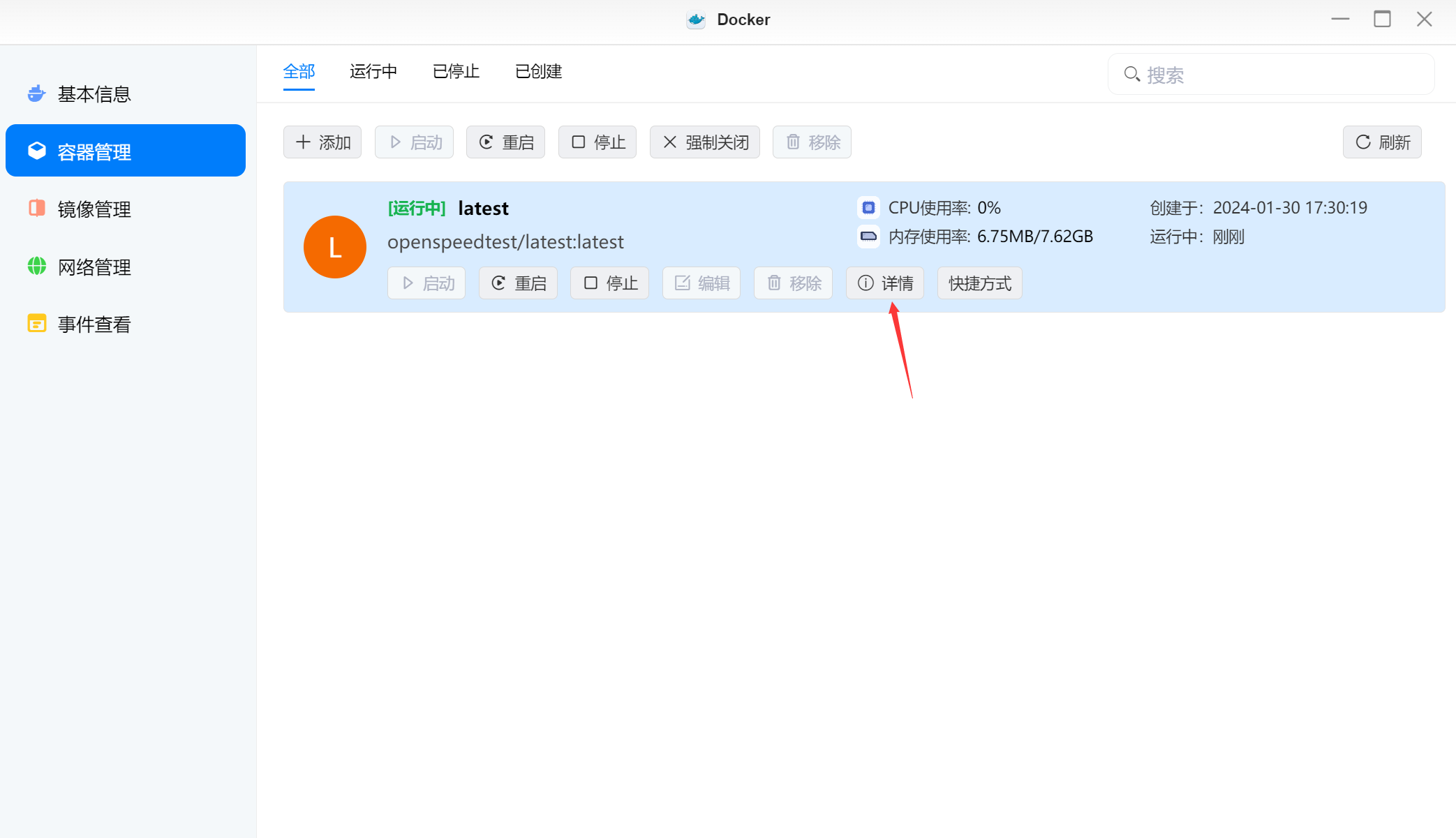 ▲镜像拉取完成后创建容器,等容器运行后,点击详情