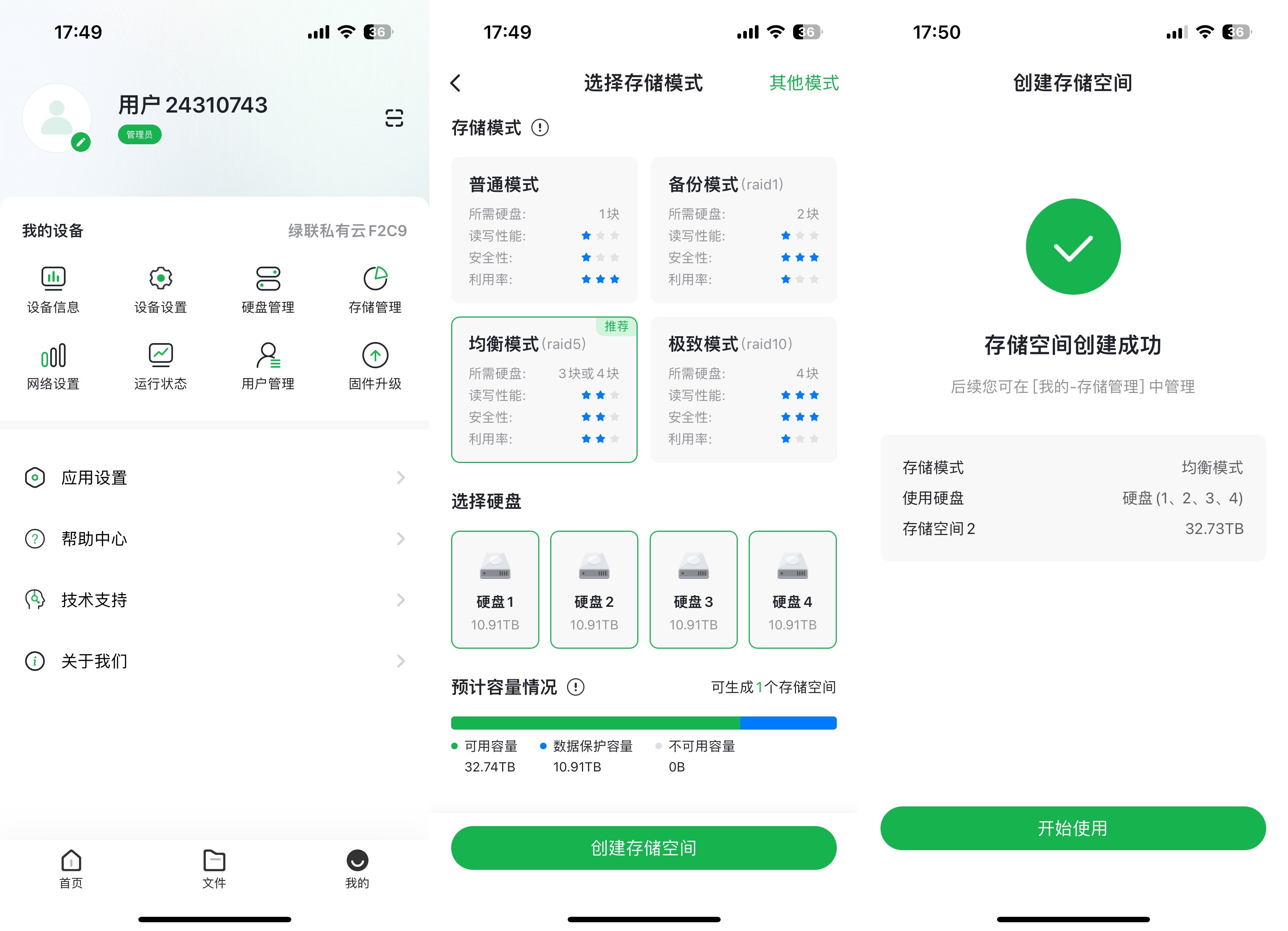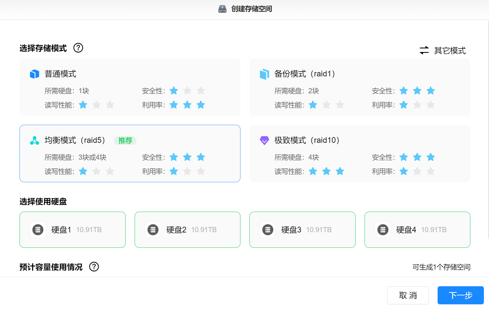 ▲进入到主页面后第一件事就是创建存储空间,选择合适的RAID模式