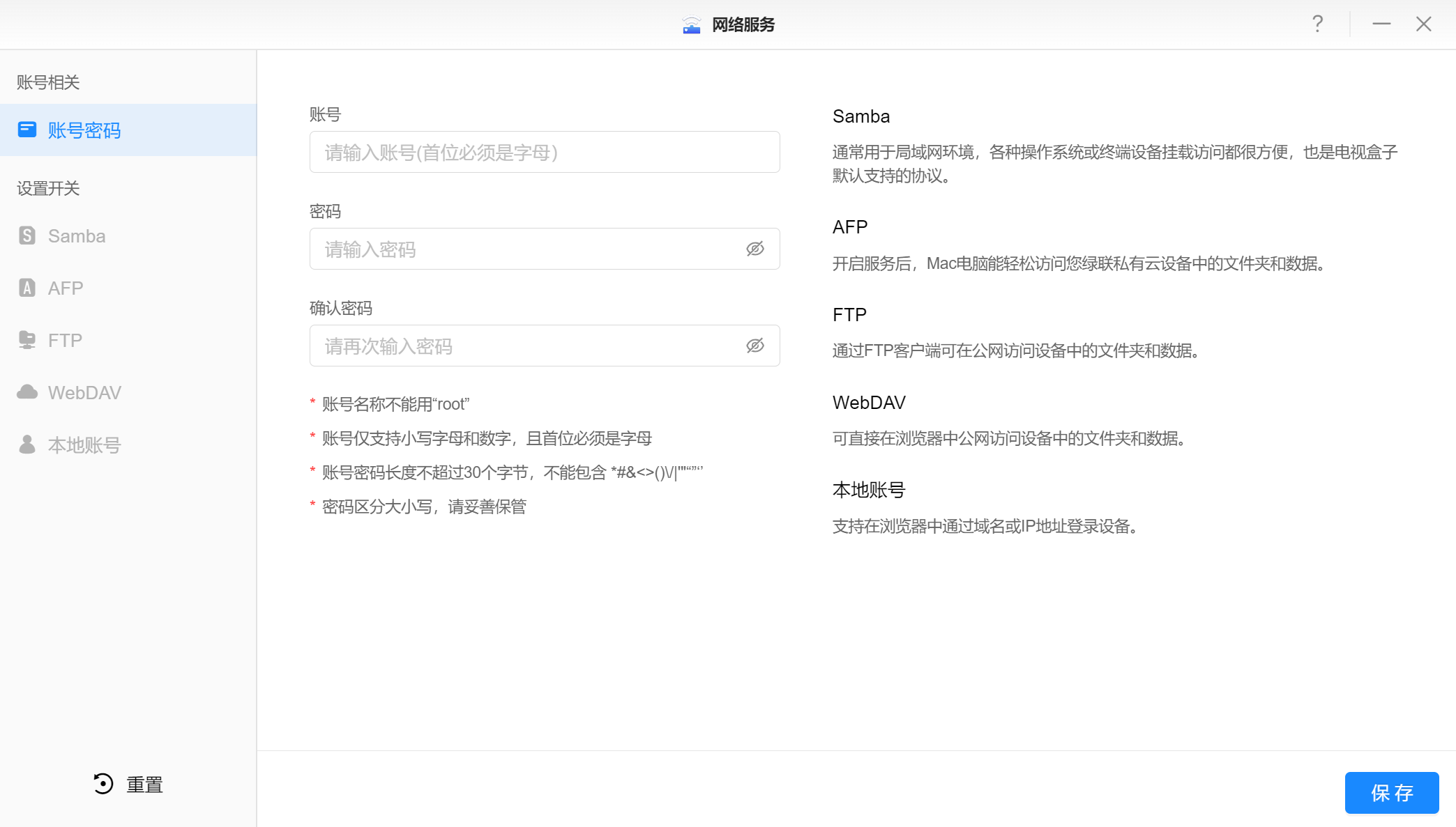▲在网络服务中需要创建账号密码才能使用Samba、AFP、FTP等等