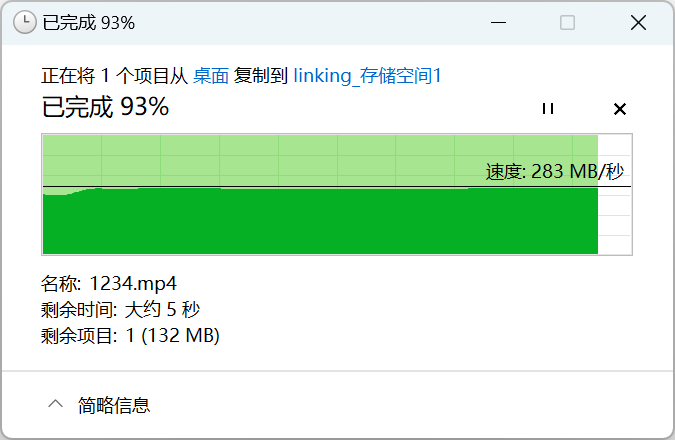 ▲启用SMB多通道前,向NAS中上传文档,此时DX4600 Pro的写入速度为283MB/s