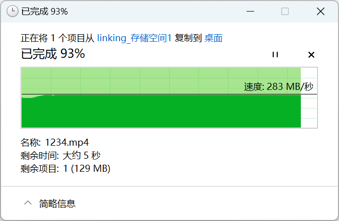 ▲启用SMB多通道前,从NAS中取回文档,此时DX4600 Pro的读取速度为283MB/s