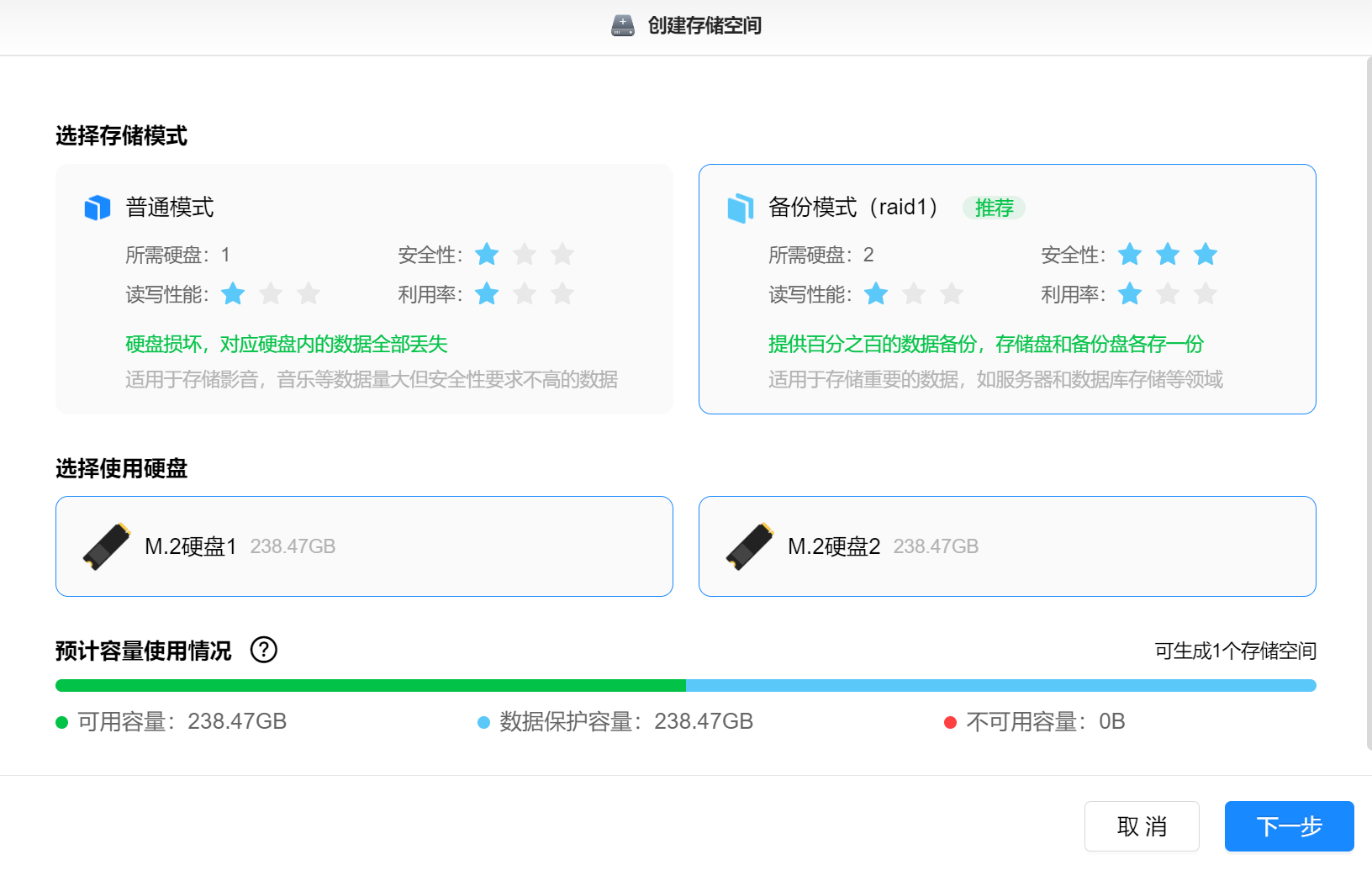 ▲如果使用M.2 SSD创建存储空间,暂时只支持普通模式(单盘模式)和RAID 1
