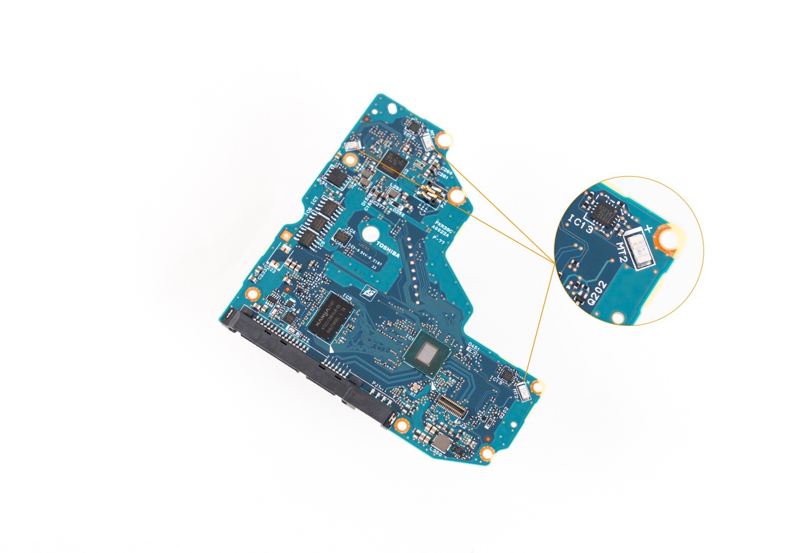 ▲东芝N300 12TB背面一览。蓝色PCB通过螺丝固定在盘体上