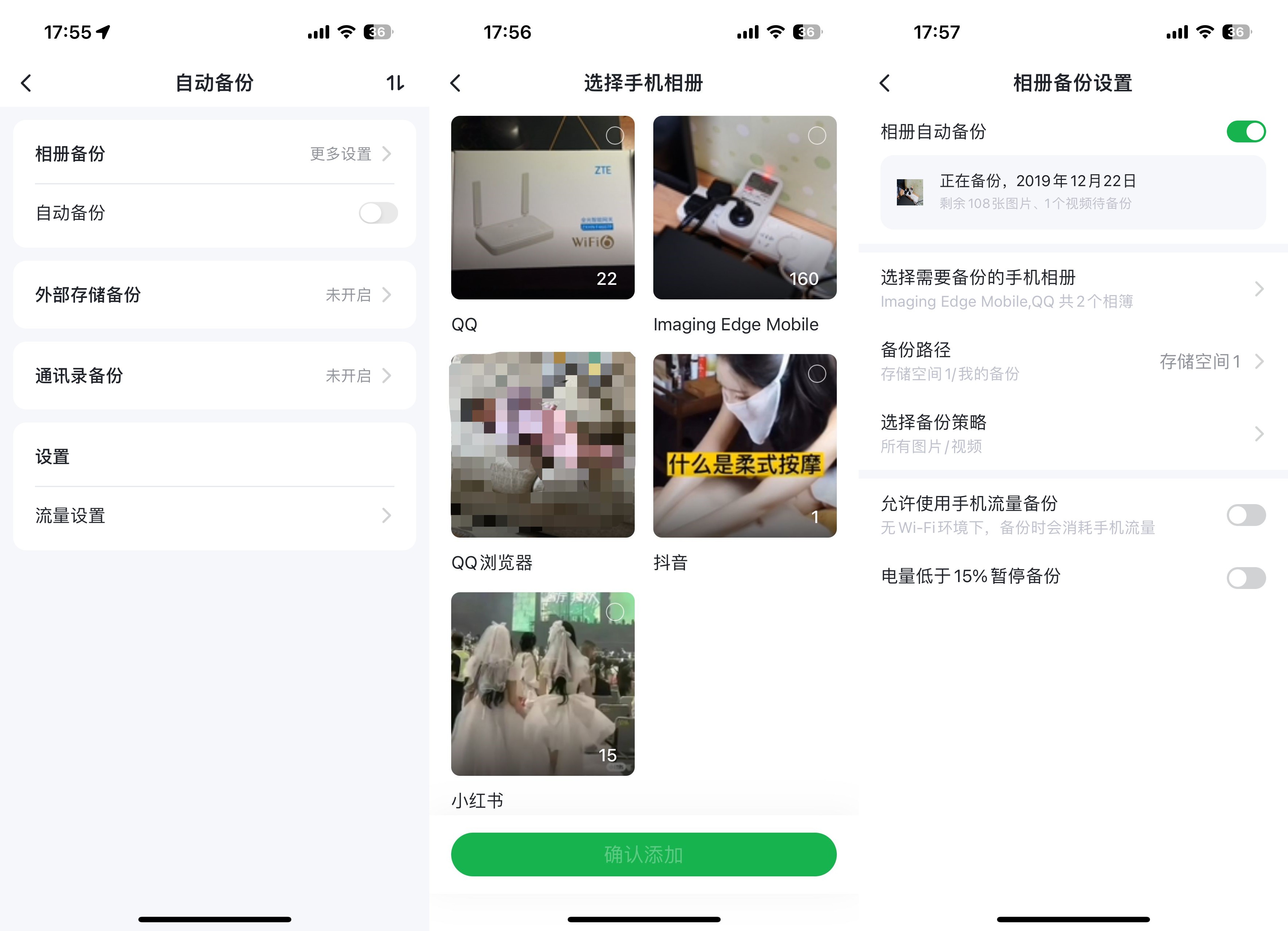 ▲相册自动备份,可以选择备份手机的相册,将其备份到NAS的存储空间,可以选择允许使用手机流量备份
