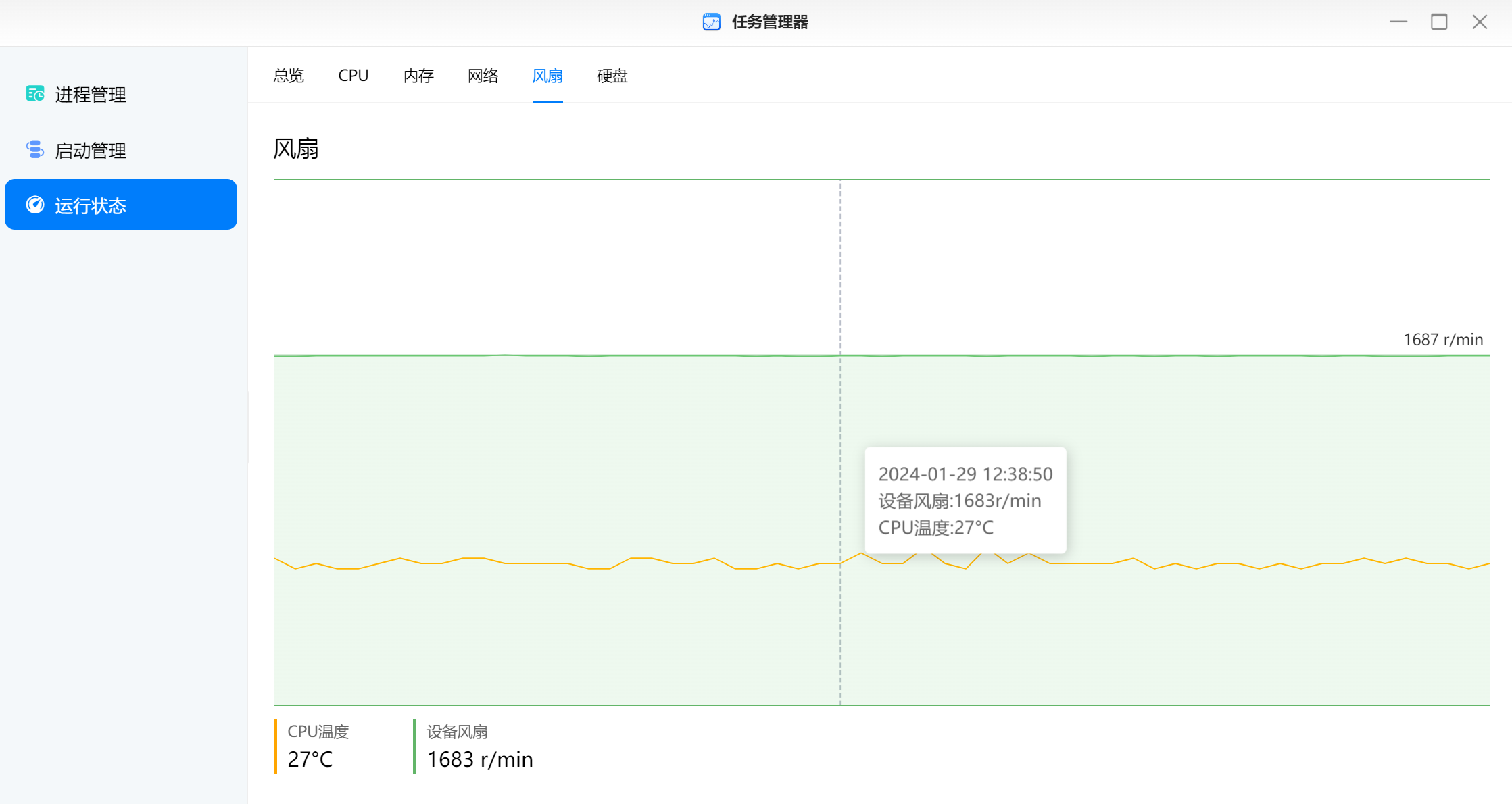 ▲风扇全速模式,此时风扇转速维持在1683RPM; CPU温度在27℃左右