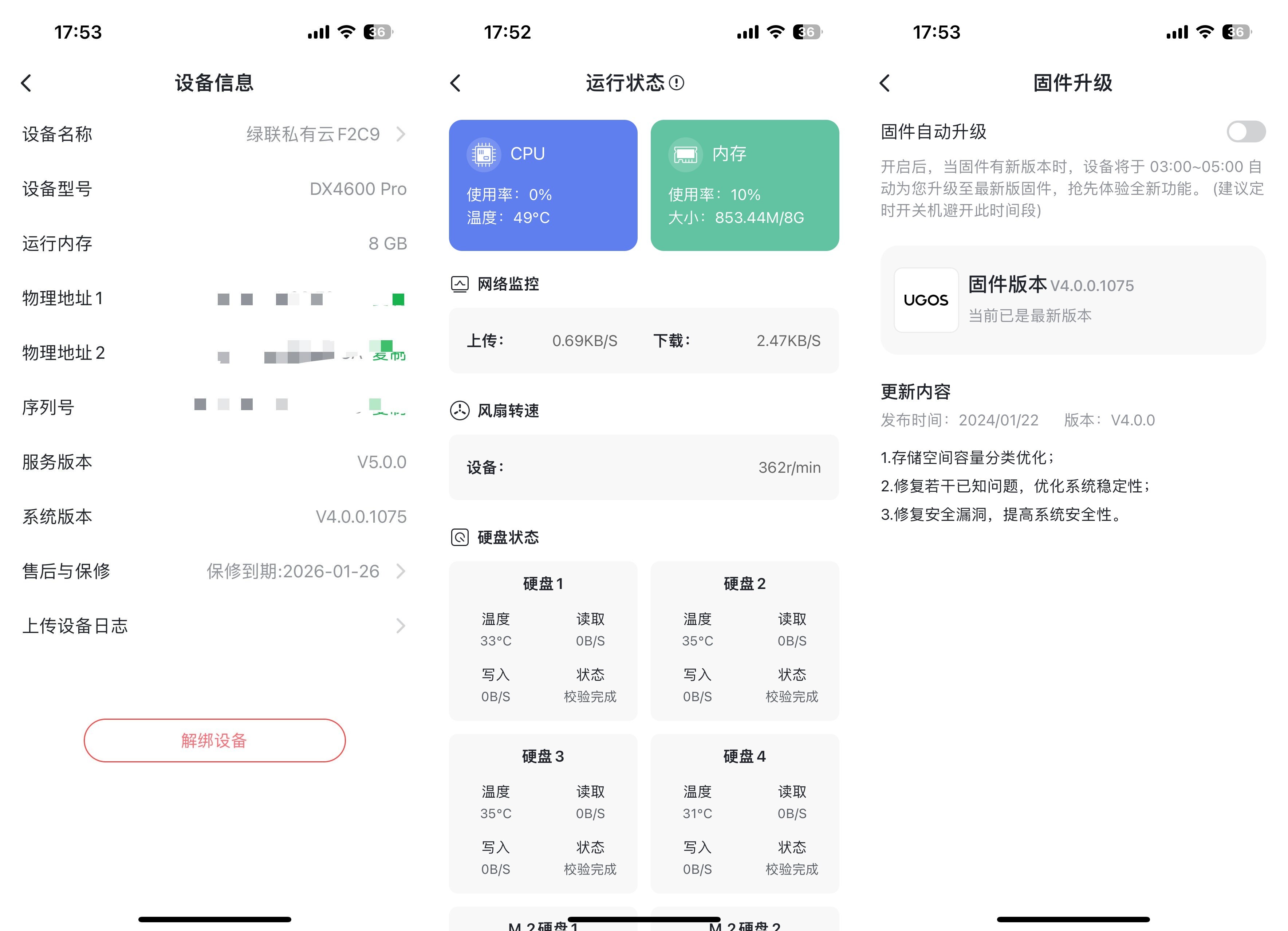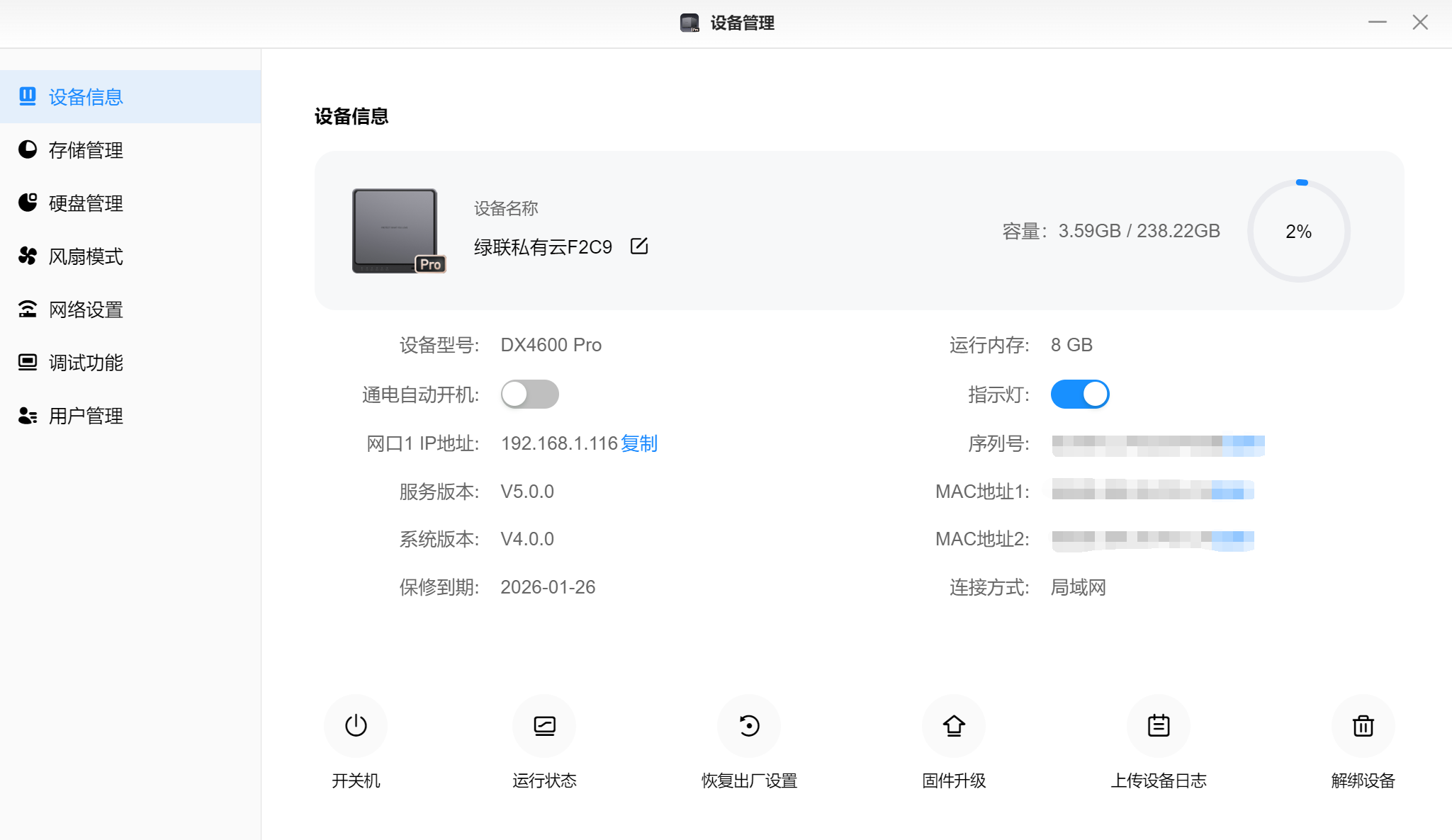 ▲在设备信息中可以查看当前NAS的IP,运行内存,固件版本等信息;还可以对设备进行开关机,恢复出厂设置,进行固件升级,解绑设备