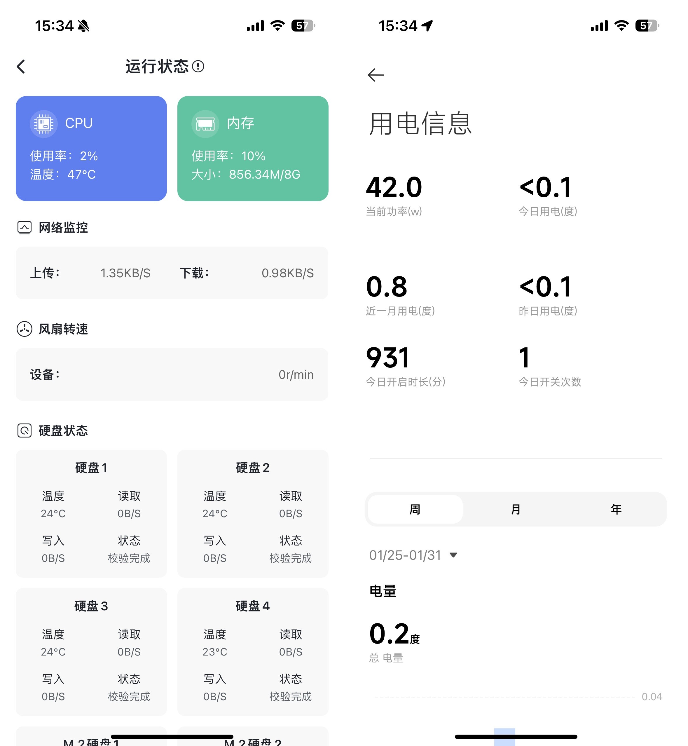 ▲此时CPU占用为2%,内存使用率为10%;NAS功耗在42W左右