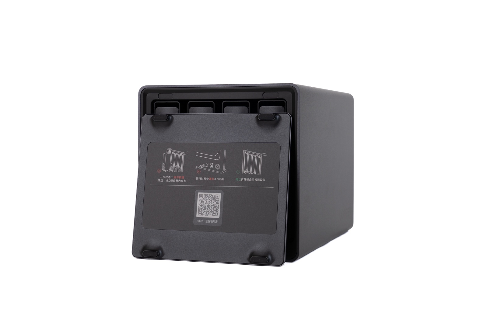 ▲磁吸挡板采用一体冲压式设计,后面贴有注意事项。四个角贴有缓冲胶垫,在HDD硬盘运行时能避免共振