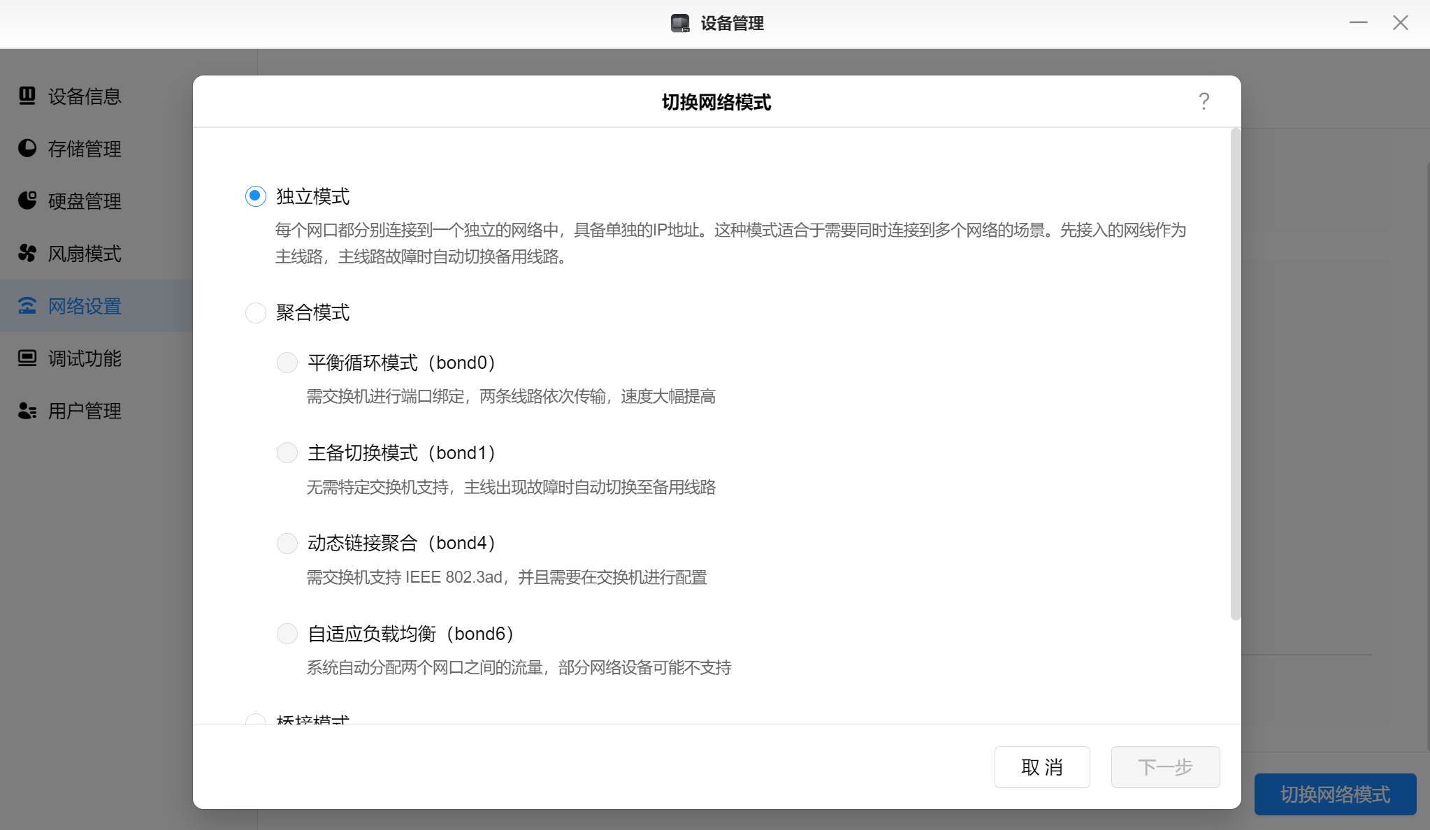 ▲网卡支持独立模式,聚合模式和桥接模式。注意的是启用SMB多通道功能只有在独立模式或者聚合模式的bond6下才能成功