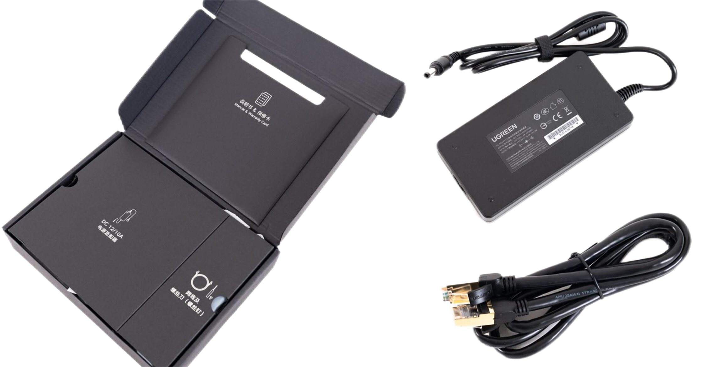 ▲附件盒里用心做了分类,附件所在位置标的清清楚楚,细节成就品质。内置一个12V 10A,最大输出功率为120W的电源适配器,以及两根7类屏蔽线。
