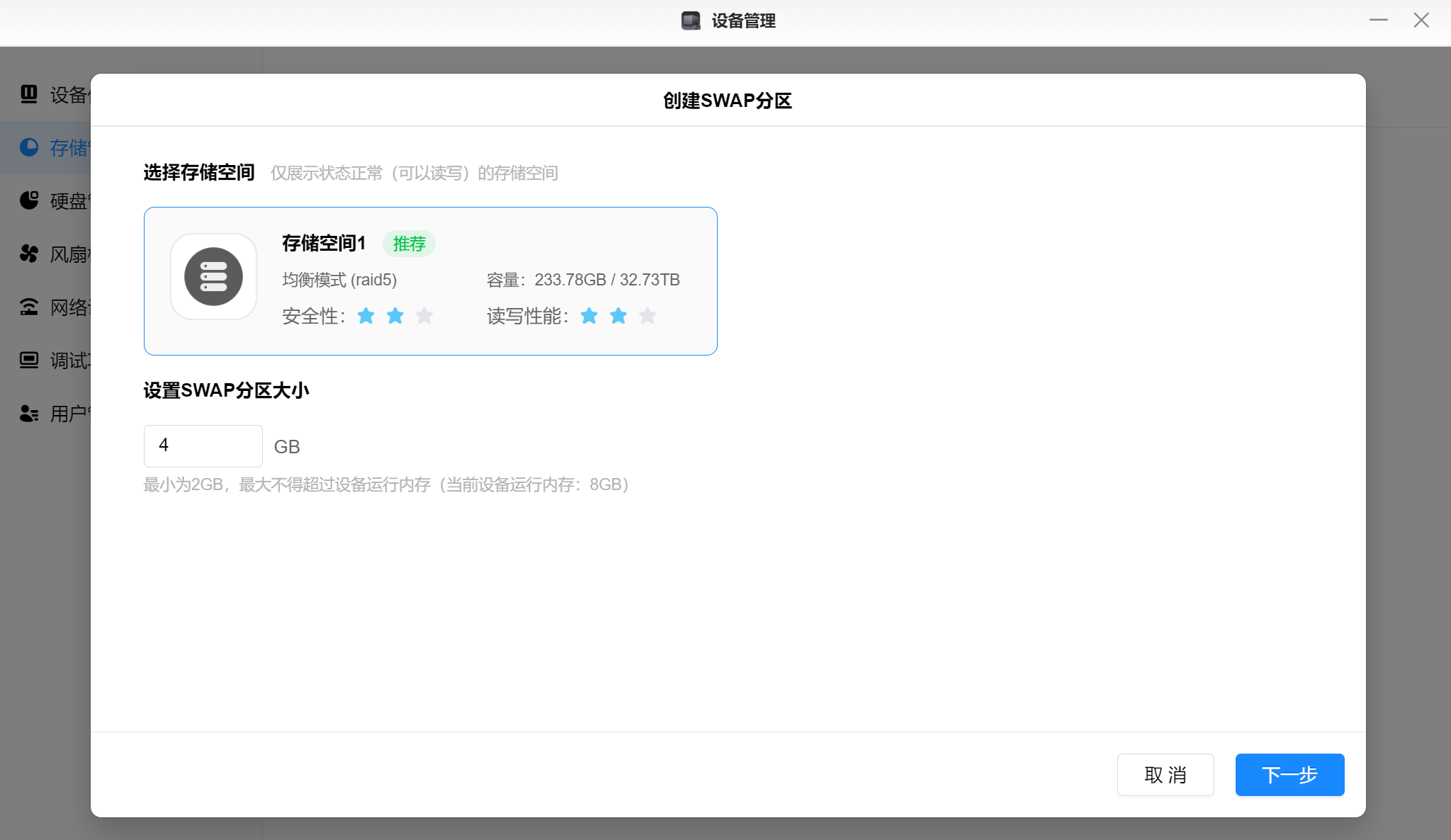 ▲当内存容量不够时可以选择创建SWAP分区来充当物理内存,建议使用读写性能较高的存储空间来作为SWAP分区