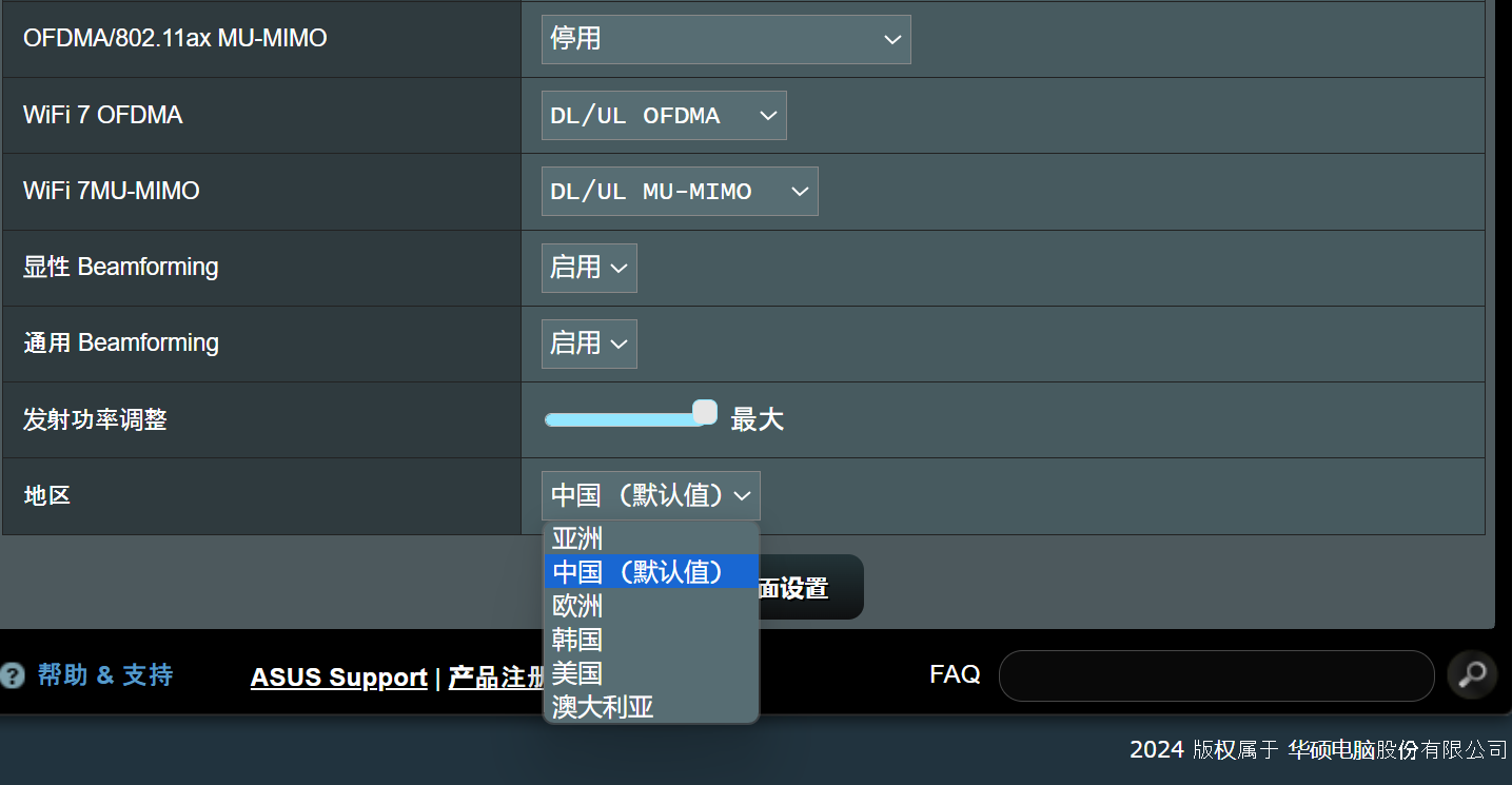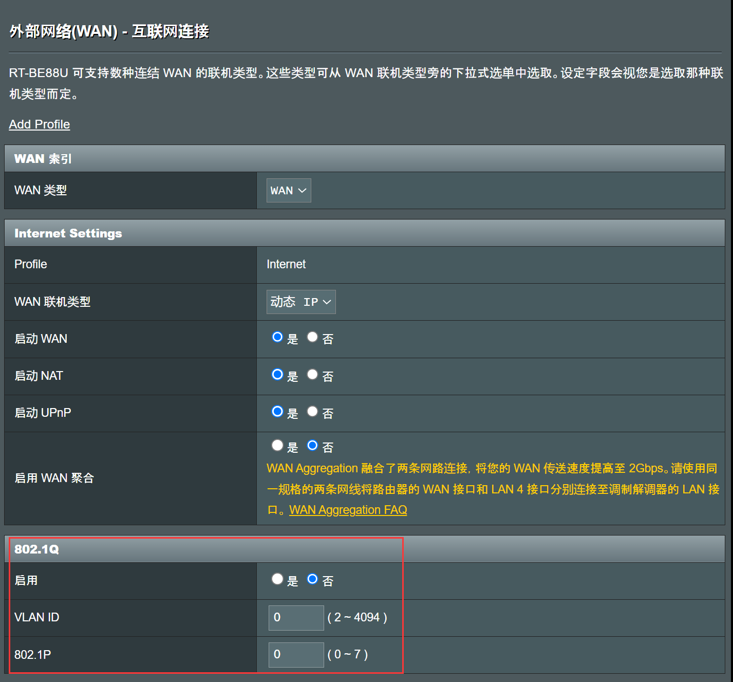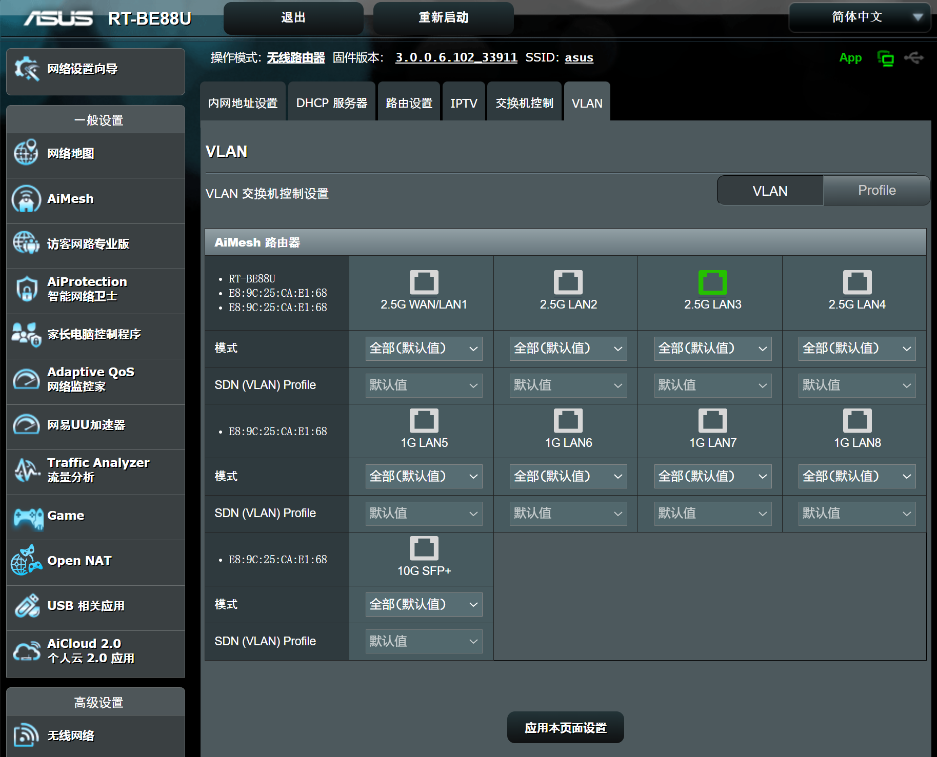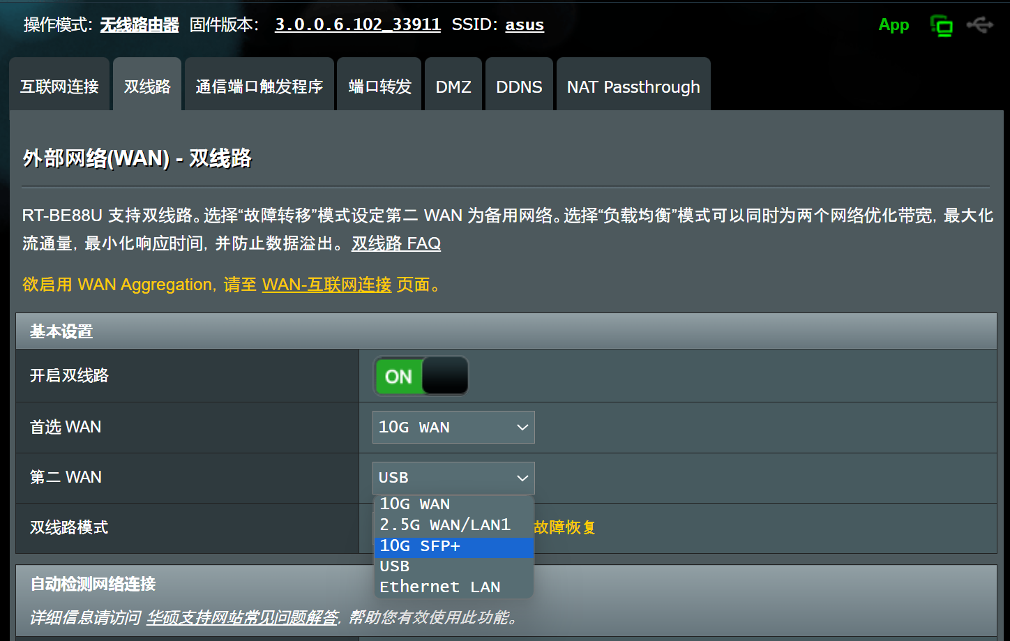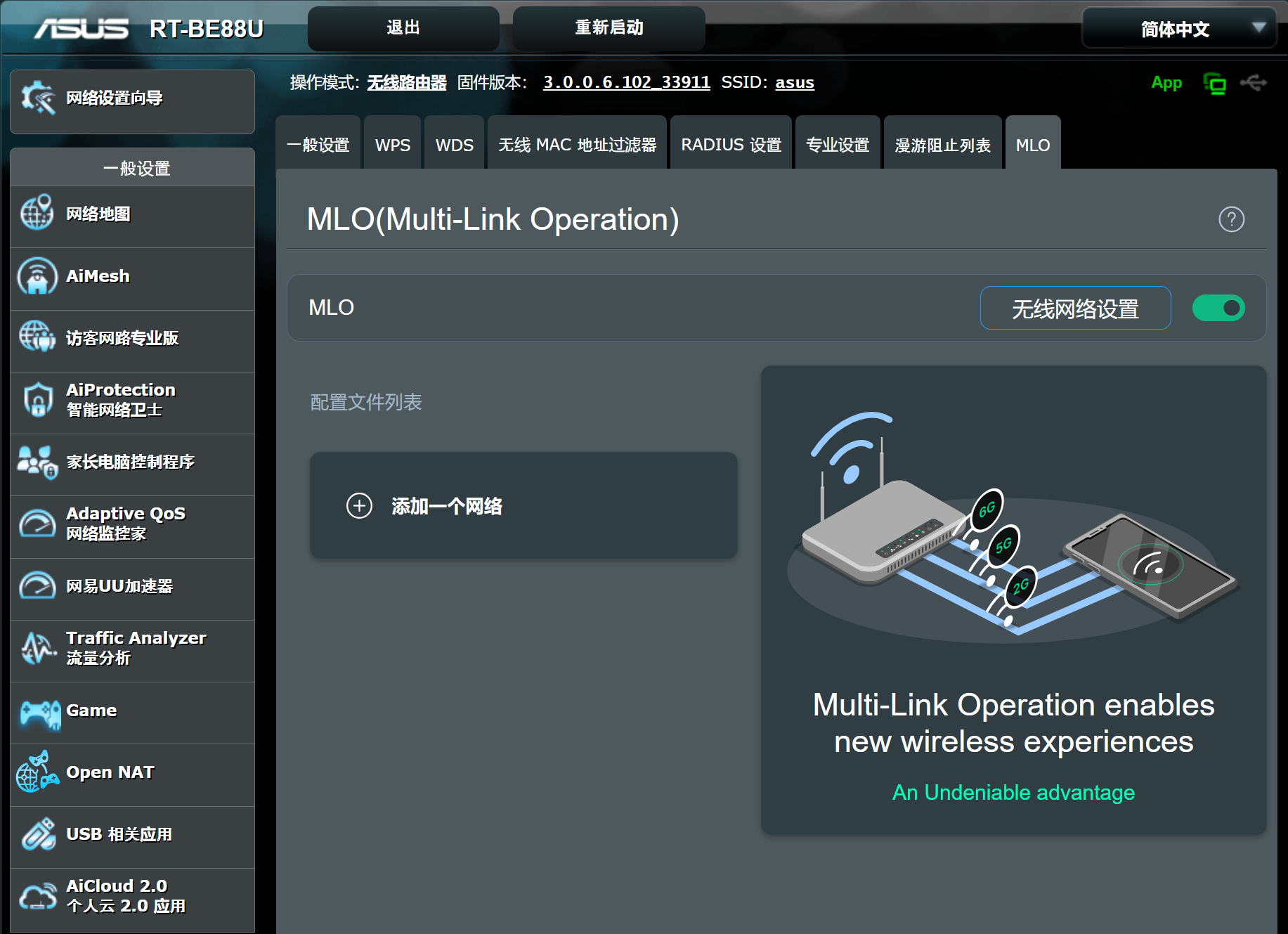▲RT-BE88U采用四核心CPU,内存容量为2048MB,配备了10G WAN/LAN、10G SFP+、2.5G WAN/LAN1、2.5G LAN2-LAN4、1G LAN5-LAN8 ▲RT-BE88U支持Aimesh2.0,可以和其他华硕路由器组网来扩大覆盖范围 ▲创建访客网络、儿童网络或自定义网络等等。可以设置带MLO功能的WiFi网络 ▲网易UU加速器基本成为了华硕路由器的标配,游戏加速都不是事 ▲RT-BE88U的5G频段支持160MHz頻宽,使用160MHz頻宽需要使用36-64频道。开启MLO功能后,Smart Connect功能会自动启用,WPA加密方式会切换成AES+GCMP256 ▲无线网络—专业设置里可以切换无线地区来达到增强WiFi的发射功率,澳大利亚地区的无线发射功率最强。同时在专业设置中引入了关于WiFi7功能的选项,例如启用WiFi 7功能,WiFi 7 OFDMA等 ▲MLO。Multi-Link Operation)芯片级多路连接技术,客户端可以同时连两个WiFi SSID,可以2.4G(40MHz)+5G(160MHz),能带来更大的吞吐量,避免网速降低、卡顿、掉线等情况 ▲可以给不同的网络划分VLAN实现隔离,在AP模式下不支持VLAN ▲外部网络,给WAN口也引入了802.1Q VLAN ▲双线路可以将WAN+任意LAN或USB作为宽带线路接入;双线路模式负载均衡用于网速叠加,故障转移用于在一条线路发生故障时切换到另一条线路吞吐量测试