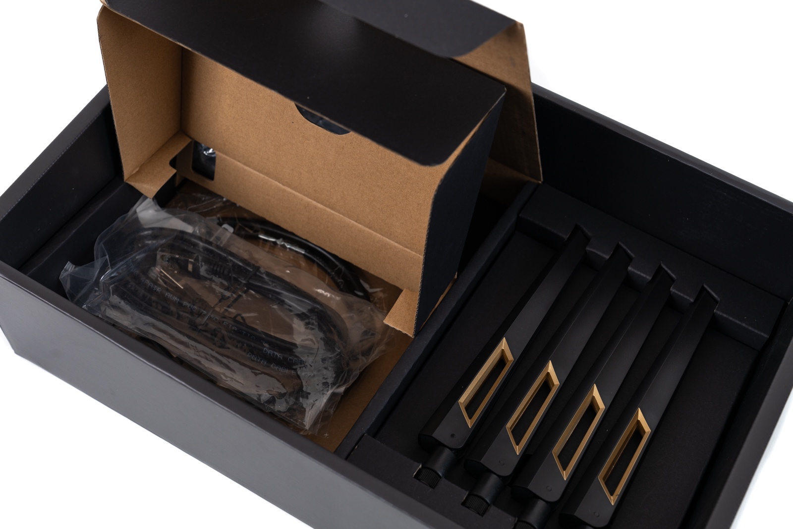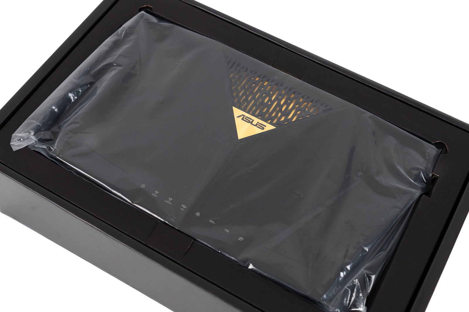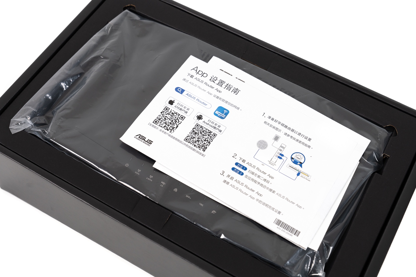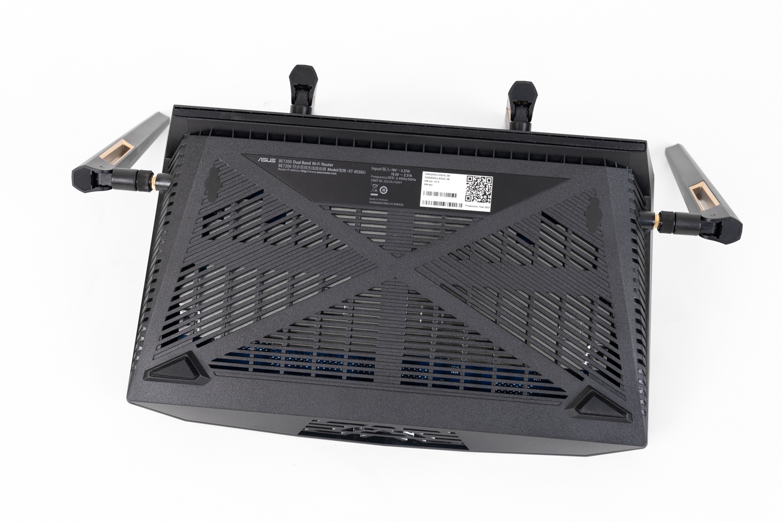 ▲RT-BE88U包装盒正面,搭载双10GE端口,2.6GHz四核心CPU,右上角可以看到WiFi 7标识 ▲打开包装盒,最上层是App设置指南 ▲然后是塑料袋包裹的RT-BE88U主机部分 ▲下层右侧是四根天线,左侧是电源适配器、网线 ▲电源适配器采用分体式设计,输出规格为19.5V 2.31A,最大输出功率为45W ▲随机附赠一根6类屏蔽网线,线径26AWG ▲组装好天线,RT-BE88U一览,Logo位置倒三角采用了烫金工艺,Logo字体为黑色 ▲RT-BE88U前端一览。除了顶端的Logo位置,其他和RT-AX88U Pro如出一辙 ▲底部开孔有利于散热,上端贴有铭牌,支持19V和19.5V两种电压 ▲相比于RT-AX88U Pro,RT-BE88U最大的变化就是背部IO接口的变动了。从左往右分别是10GbE WAN/LAN、10G SFP+、2.5GbE WAN/LAN1、2.5GbE LAN2-LAN4、1GbE LAN5-LAN8、Reset、USB3.0、DC in、Power Button拆解视频