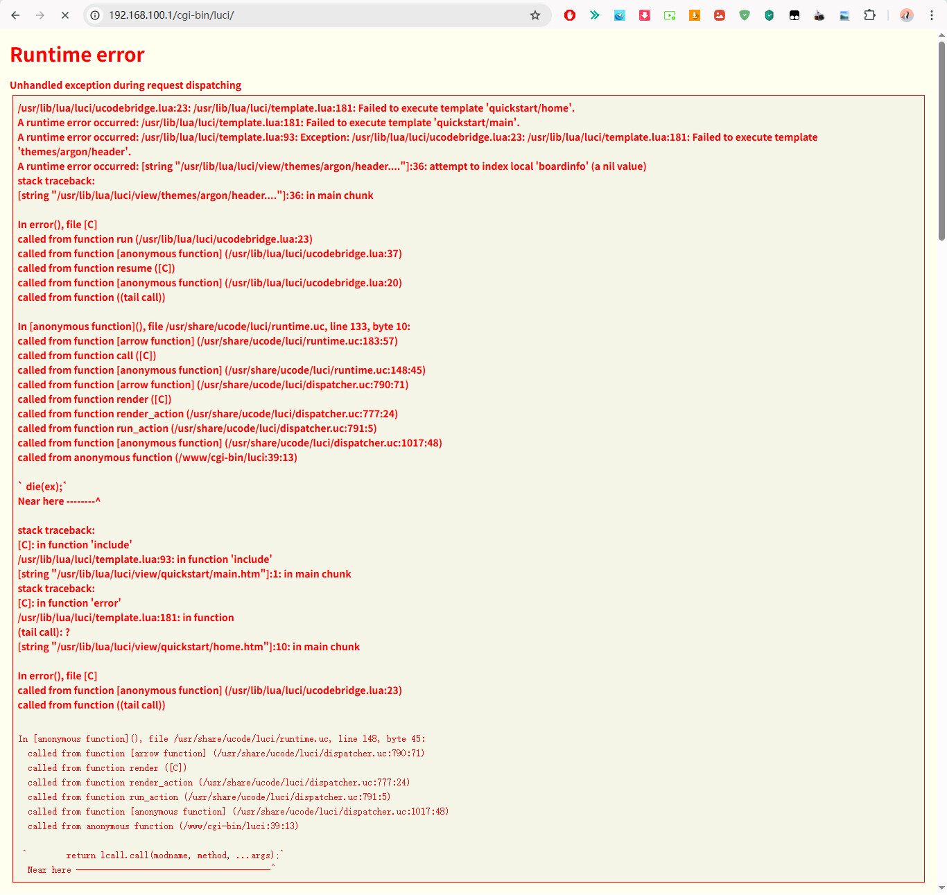 先说一下系统环境,N100,6网口,无虚拟机,纯istoreOS系统,分身用ShadoWRT。 说一下问题,登录后台进不去,然后卡一会就会出出错代码,之前也出现过类似的问题,分身系统出的频率高一点,主系统也有过,但是有过那么两三次。这次的固件是恢复初始后,重新刷固件不保留配置更新的新系统,才过两三天问题又出现了。也发给AI看了,依旧没法解决。